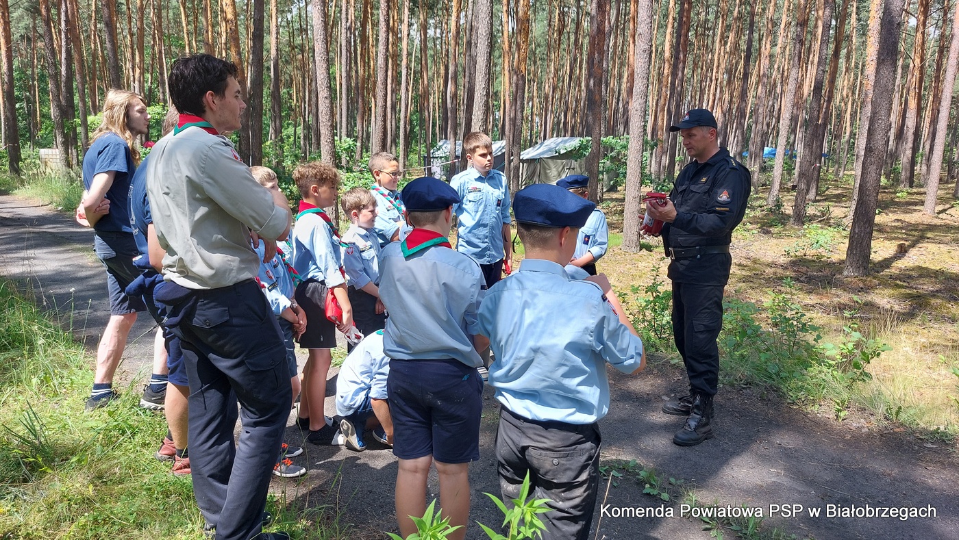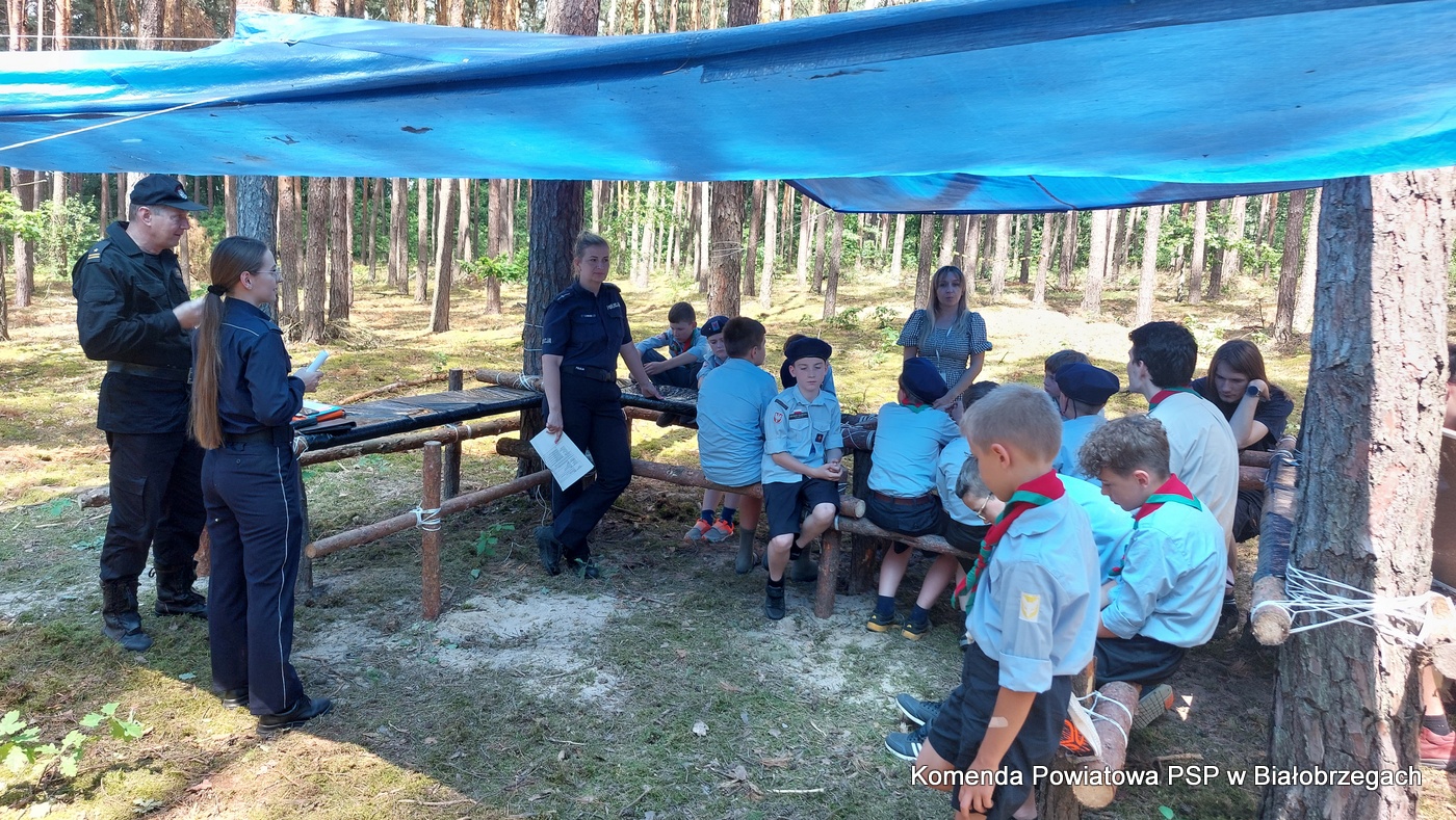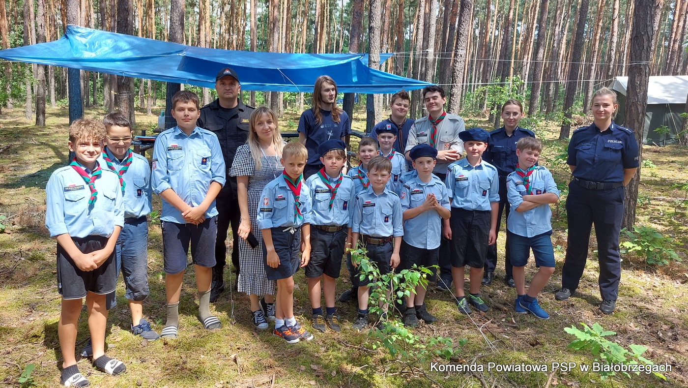 Funkcjonariusze Komendy Powiatowej Państwowej Straży Pożarnej w Białobrzegach, Komendy Powiatowej Policji w Białobrzegach oraz pracownicy Powiatowej Stacji Sanitarno-Epidemiologicznej w Białobrzegach w dniu 04.07.2022r. odwiedzili uczestników obozu celem przeprowadzenia działań profilaktycznych.