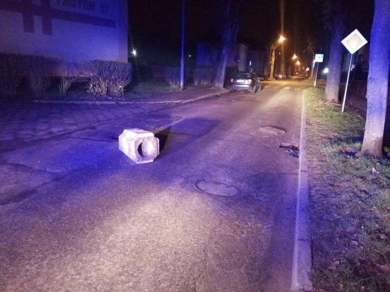 24.11.2022 o godzinie 02:43 strażacy z KP PSP w Białogardzie otrzymali zgłoszenie o leżącym na ulicy Chopina betonowym koszu na śmieci i pokrywie studzienki kanalizacyjnej.