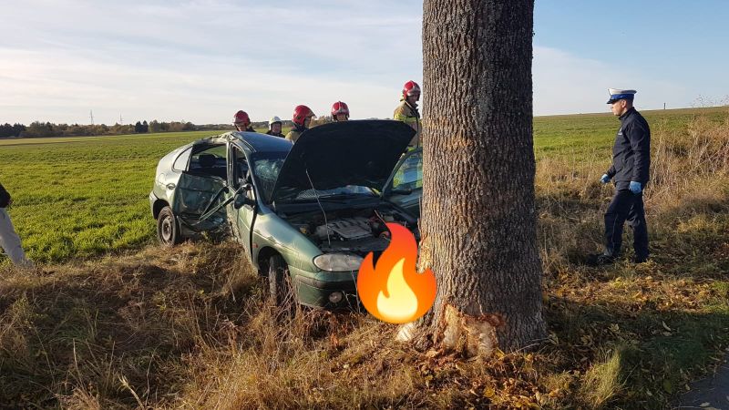 Strażacy po przybyciu na miejsce zdarzenia stwierdzili, że pojazd osobowy marki Renault zjechał z drogi i uderzył w drzewo. Kierowca opuścił pojazd o własnych siłach, a w samochodzie pozostawał przytomny pasażer.