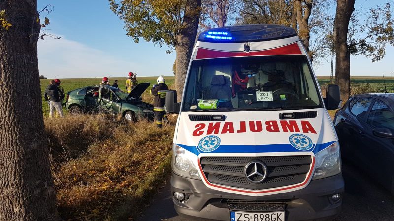 20.10.2022 o godzinie 15:37 Dyżurny Stanowiska Kierowania odebrał zgłoszenie o wypadku drogowym w Białogardzie na drodze wyjazdowej w kierunku Rąbina. Auto uderzyło w drzewo, a w środku są osoby poszkodowane.