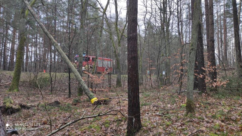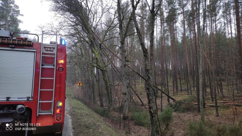 Zastęp JRG Białogard i OSP Rogowo o godzinie 10:25 zostały przedysponowane do nowej lokalizacji w okolicach miejscowości Moczyłki. Strażacy po dojeździe na miejsce zdarzenia zabezpieczyli teren działań i usunęli zagrożenia w postaci pochylonych konarów nad jezdnią.