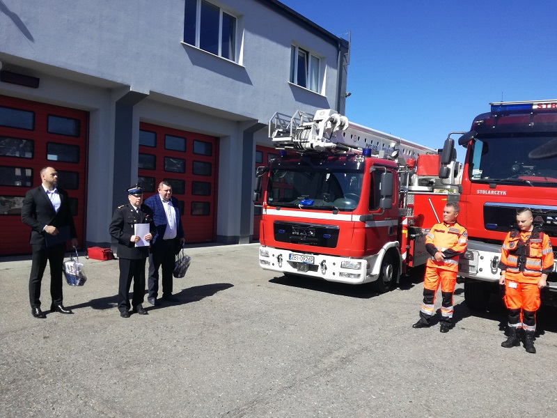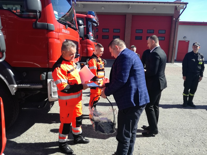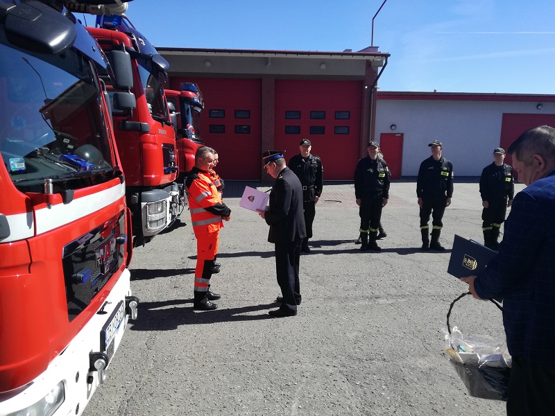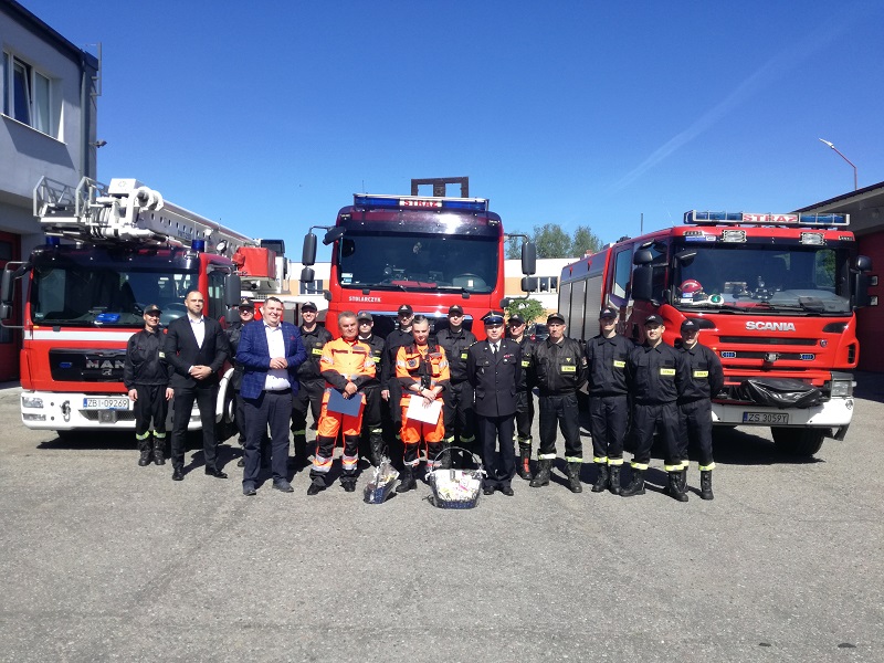 31 maja 2021 roku w Komendzie Powiatowej PSP w Białogardzie odbyła się uroczystość wręczenia podziękowań ratownikom medycznym, którzy w nocy 29 maja 2021 roku uratowali z pożaru czteroosobową rodzinę. Około godziny 3.40 w budynku mieszkalnym dwurodzinnym w miejscowości Dobrowo w powiecie białogardzkim doszło do pożaru. Informację o zdarzeniu przekazał do stanowiska kierowania Zespół Ratownictwa Medycznego, który jadąc do zgłoszenia zauważył ogień i podjął działania ratownicze. Medycy zaalarmowali śpiącą matkę z trójką dzieci i ewakuowali na zewnątrz obiektu. Pożar ugasili strażacy z JRG PSP w Białogardzie i druhowie z OSP w Tychowie. Za swą bohaterską postawę podziękowanie i drobne upominki z rąk Komendanta Powiatowego PSP w Białogardzie st. bryg. Jacka Szpuntowicza, Starosty Białogardzkiego pana Piotra Pakuszto i Zastępcy Starosty Białogardzkiego pana Sebastiana Balcerzaka odebrali pan Zygmunt Skrzyniarz i pan Aleksander Strzelecki. Kolejnym powodem do dumy białogardzkich strażaków jest fakt, że st. str. Aleksander Strzelecki jest strażakiem – stażystą w KP PSP w Białogardzie.