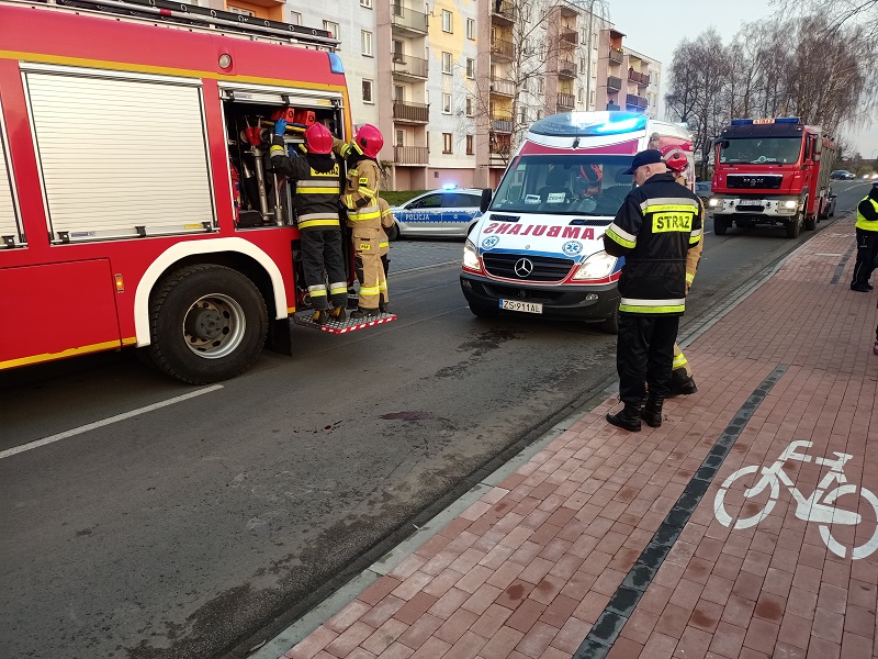 24 listopada 2020 r. ok. godz. 15.10 na ulicy Bolesława Śmiałego w Białogardzie doszło do potrącenia pieszej przez auto osobowe VW T5. Na miejsce zdarzenia pierwsze dotarły zastępy straży pożarnej z KP PSP w Białogardzie. Po dojeździe strażacy zabezpieczyli miejsce zdarzenia, a rota medyczna podjęła czynności ratownicze nieprzytomnej poszkodowanej. Kobieta odzyskała świadomość i pozostawała w logicznym kontakcie słownym z ratownikami. Strażacy dokonali wstępnego badania urazowego z jednoczesną stabilizacją kręgosłupa na odcinku szyjnym. Zapewnili komfort cieplny i wsparcie psychiczne kobiecie. W trakcie prowadzonych działań na miejsce zdarzenia dojechał ZRM, który przejął poszkodowaną. W działaniach brały udział trzy zastępy strażackie z KP PSP w Białogardzie, Policja i ZRM. Straty w pojeździe oszacowano na 3 tys. zł.