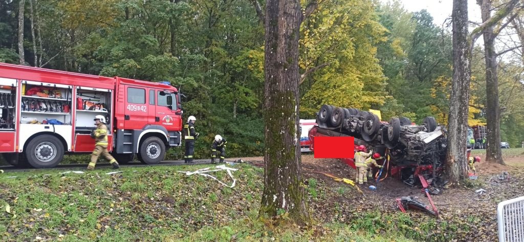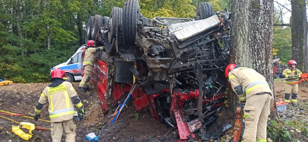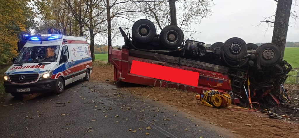 25.10.2023 Dyżurny Stanowiska Kierowania odebrał zgłoszenie o zdarzeniu drogowym pod Tychowem, w którym uczestniczył samochód ciężarowy.