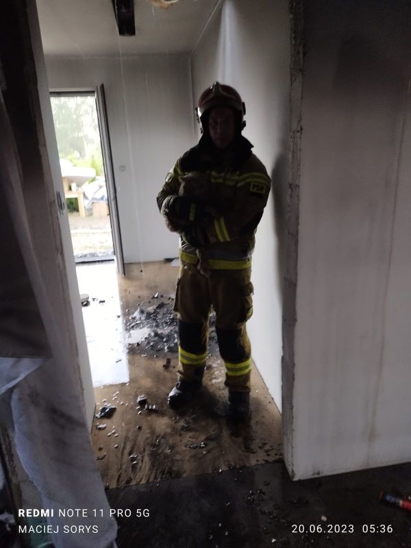 W trakcie działań rota pracująca wewnątrz budynku uratowała małego kotka.