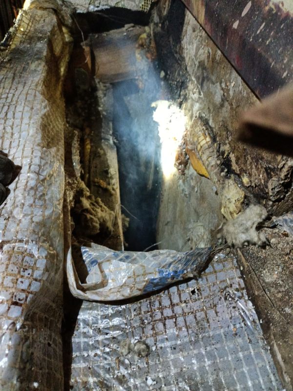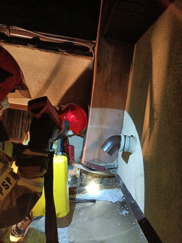 Po przeprowadzeniu rozbiórki przypuszczenia okazały się słuszne. Pożarem objęta była belka przy kominie. Pożar został ugaszony przy pomocy hydronetki a miejsce działań sprawdzone kamerą termowizyjną w celu wyeliminowania ukrytych zarzewi ognia. W związku z brakiem przeglądu komina i pracami rozbiórkowymi właściciel otrzymał zakaz użytkowania przewodu do wizyty kominiarza.