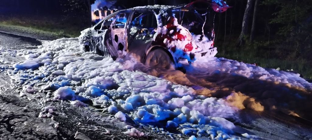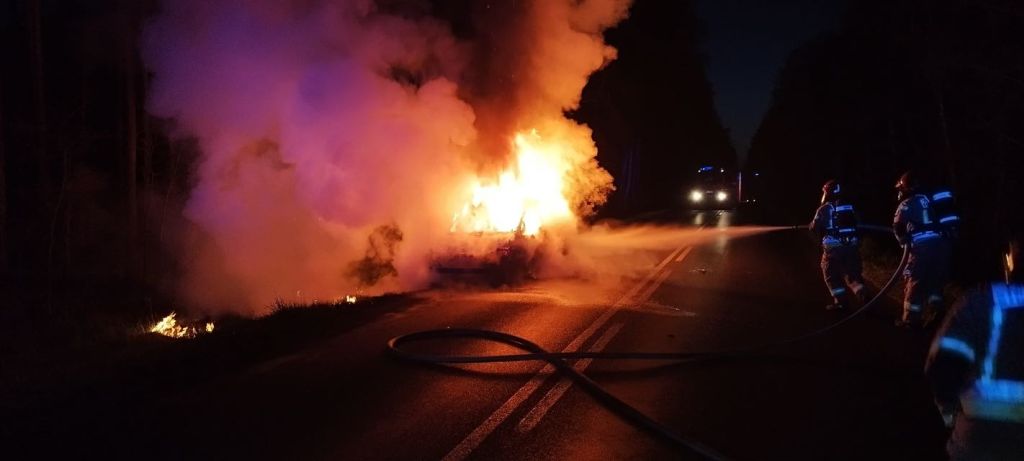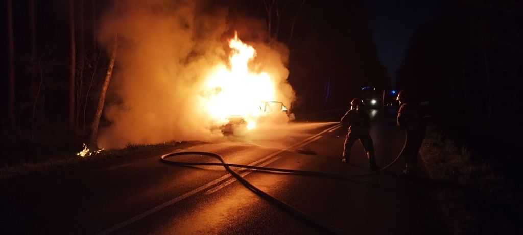 30.04.2025 o godzinie 21:43 Dyżurny Stanowiska Kierowania KP PSP w Białogardzie odebrał zgłoszenie o pożarze samochodu osobowego na drodze wojewódzkiej nr 163, w kierunku Wałcza. Na miejsce zadysponowano dwa zastępy z JRG Białogard.