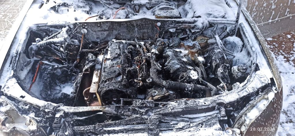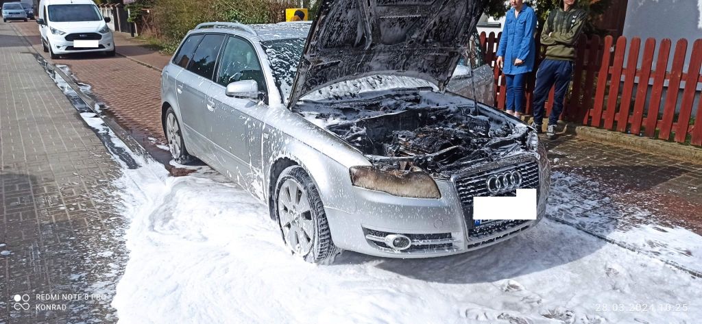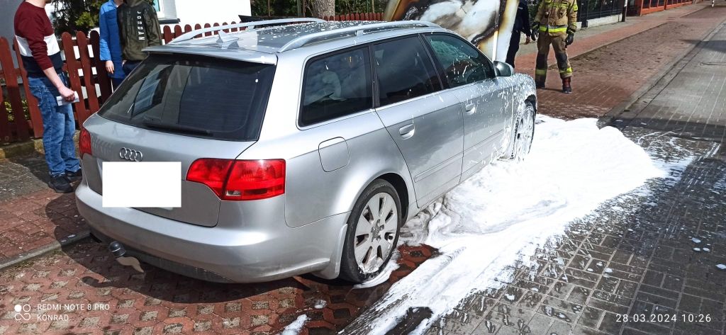 28.03.2024 o godzinie 10:05 Dyżurny Stanowiska Kierowania odebrał zgłoszenie o pożarze samochodu osobowego w Białogardzie przy ul. Wawelskiej.