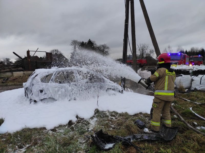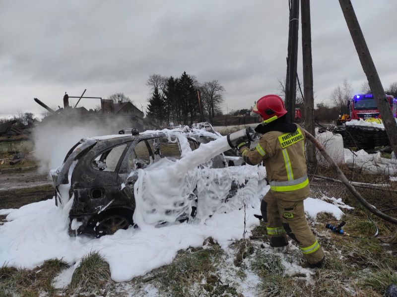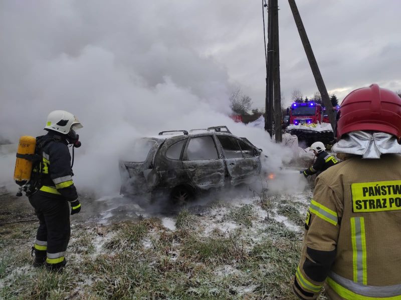 03.02.2022 o godzinie 08:49 do Stanowiska Kierowania Komendanta Powiatowego Państwowej Straży Pożarnej wpłynęło zgłoszenie o pożarze auta osobowego w miejscowości Pobłocie Wielkie.