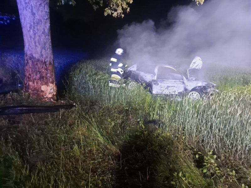 Na miejsce zadysponowany został zastęp Ochotniczej Straży Pożarnej z Karlina. Strażacy po dojeździe na miejsce zdarzenia zabezpieczyli teren akcji. Następnie w wyniku rozpoznania stwierdzono, że pojazd osobowy uderzył w drzewo i zapalił się. Osoby podróżujące autem opuściły je o własnych siłach i nie wymagają pomocy medycznej. Działania zastępu polegały na podaniu 1 prądu piany ciężkiej na palący się pojazd do całkowitego ugaszenia.