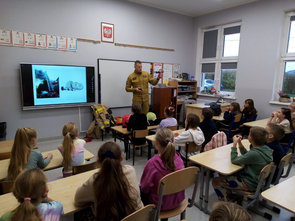 Strażacy odwiedzili także szkoły podstawowe. Podczas tych wizyt uczniom pierwszych klas przedstawiono zasady korzystania z numeru alarmowego, opowiedziano o bezpieczeństwie podczas zimy, przedstawiono zawód strażaka. Dzieci dowiedziały się jak dbać o swoje bezpieczeństwo oraz jak ważną rolę pełnią służby ratunkowe. (około 80 dzieci).