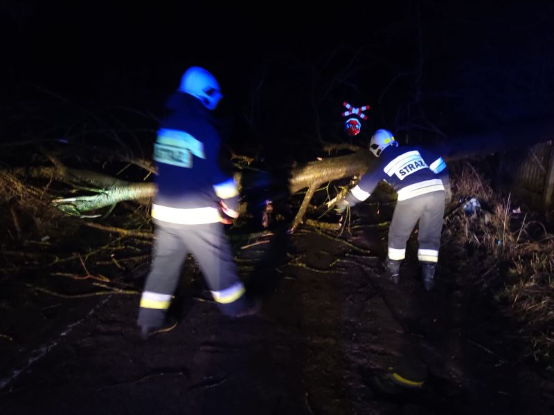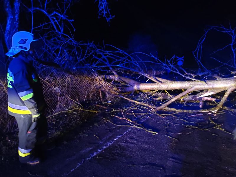Drzewo przewrócone przez silny wiatr. Działania zastępu polegały na zabezpieczeniu miejsca zdarzenia, oświetleniu terenu działań, usunięcia drzewa przy pomocy mechanicznych pił do cięcia drewna.
