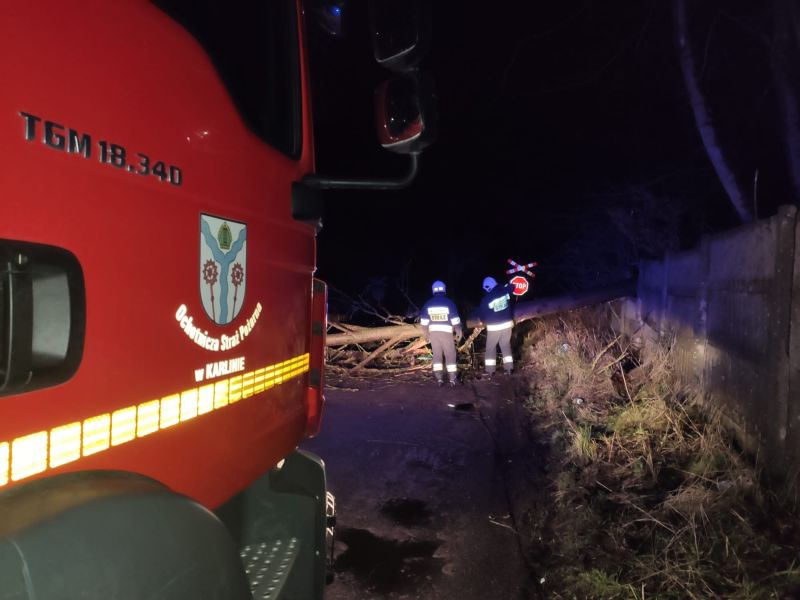 Drzewo przewrócone na Drogę Wojewódzka DW163 w miejscowości Karlino przy ulicy Kołobrzeskiej. Działania zastępu polegały na zabezpieczeniu i oświetleniu miejsca zdarzenia. Następnie strażacy usunęli drzewo i udrożnili przejazd.