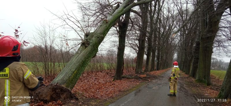 27.01.2022 o godzinie 11:23 Dyżurny Stanowiska Kierowania Komendanta Powiatowego Państwowej Straży Pożarnej w Białogardzie odebrał zgłoszenie o niebezpiecznie pochylonym drzewie nad drogą znajdującą się w okolicach miejscowości Nawino.