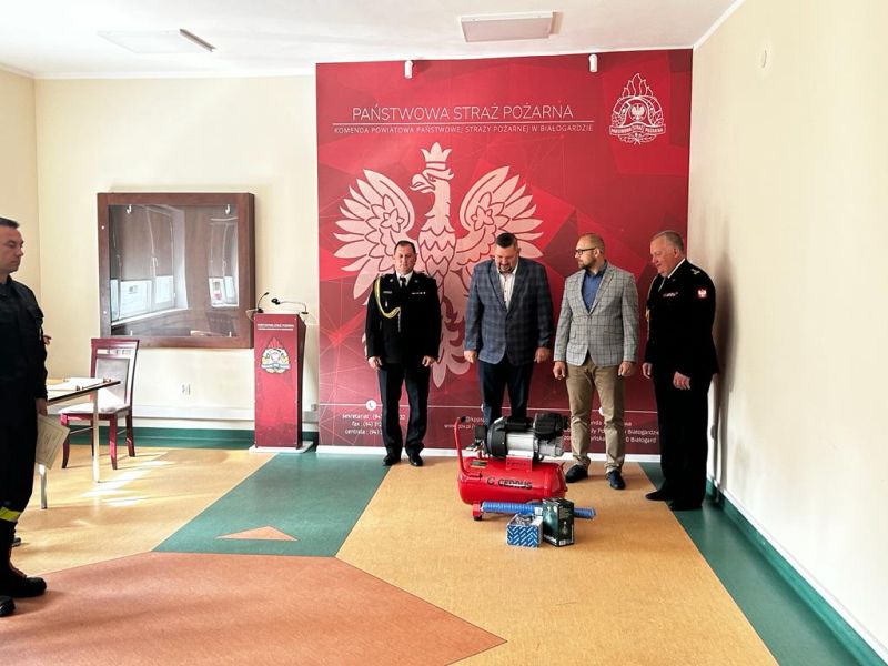 W uroczystości udział wziął Starosta Powiatowy w Białogardzie Piotr Pakuszto wraz ze swoim zastępcą Dominikiem Kołodziejskim, którzy przekazali na ręce Komendanta sprzęt w postaci sprężarki wraz z dodatkowym osprzętem.