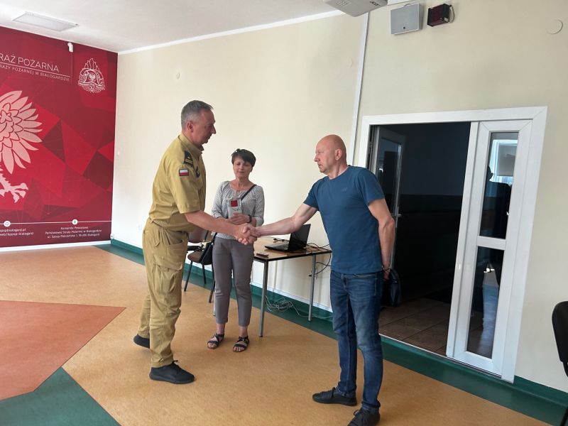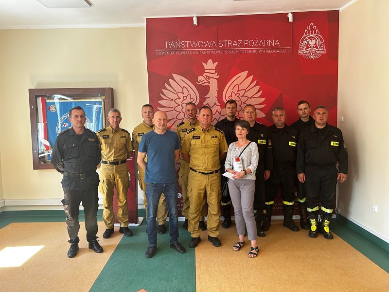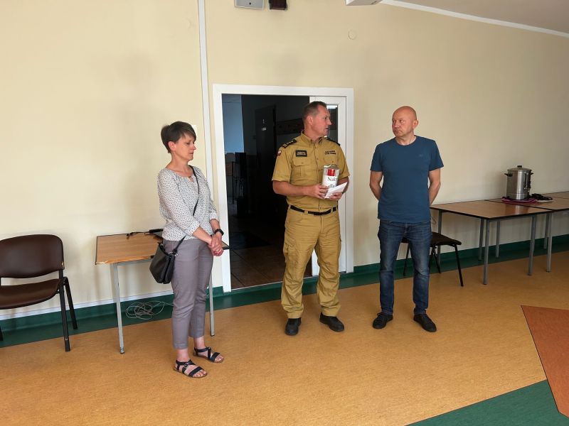 13.06.2023 Komendę Powiatową PSP w Białogardzie odwiedzili rodzicie asp. Piotra Milczarka. Piotrek uległ wypadkowi 27 kwietnia 2023 r. Wracając po służbie był świadkiem zdarzenia drogowego na drodze ekspresowej S6. W trakcie udzielania pomocy został potrącony przez rozpędzone auto. W wyniku zderzenia został ciężko ranny. Przyjaciele, rodzina i strażacy z całej Polski wspólnie organizują zbiórkę w celu zebrania środków na leczenie i rehabilitację Piotra. W dniu dzisiejszym strażacy przekazali zebrane pieniądze. Zbiórkę zorganizowano w białogardzkiej komendzie oraz podczas rajdu rowerowego gdzie strażacy Ochotniczej Straży Pożarnej w Kościernicy przygotowali specjalny punkt regeneracyjny. Zebrane pieniądze przekazał Dowódca Jednostki Ratowniczo – Gaśniczej w Białogardzie mł. bryg. Mariusz Wenta wraz ze swoim zastępcą kpt. Sylwestrem Jerenkiewiczem. Komendant Powiatowy PSP w Białogardzie st. bryg. Dariusz Szperlak przekazał również życzenia szybkiego powrotu do zdrowia i do służby.