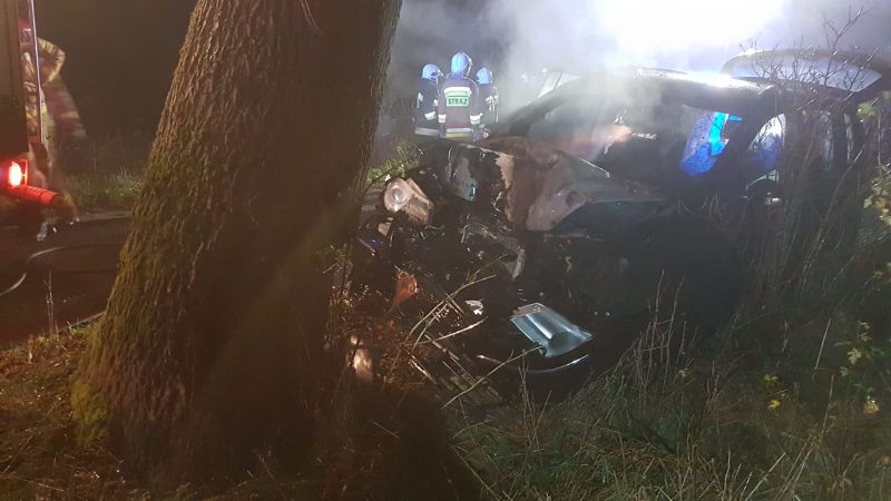 Strażacy po dojeździe na miejsce zdarzenia natychmiast przystąpili do działań zabezpieczając miejsce wypadku. W wyniku rozpoznania ustalili, i że auto osobowe uderzyło w drzewo i zapaliło się. Kierujący pojazdem został ewakuowany przez Policję i Zespół Ratownictwa Medycznego przed przybyciem Straży Pożarnej. Działania Strażaków polegały na podaniu prądu wody na palące się auto. Pożar został ugaszony.
