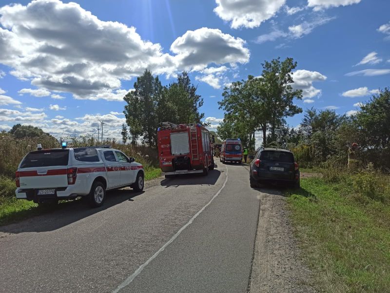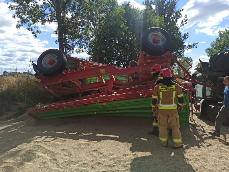 02.09.2022 o godzinie 12:45 Dyżurny SK KP PSP Białogard odebrał zgłoszenie o wypadku traktora transportującego zboże w okolicy miejscowości Dębczyno.