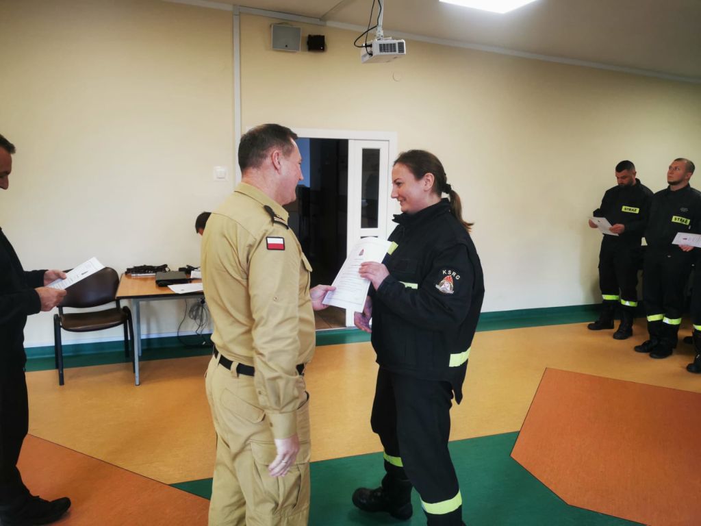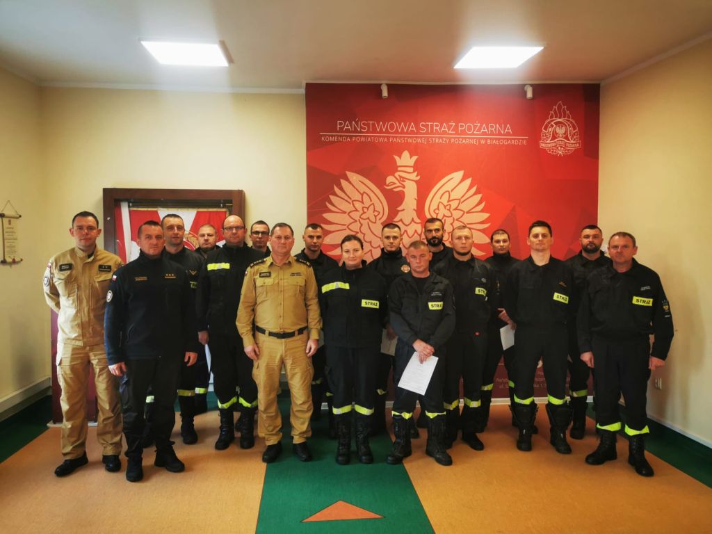 15.10.2023 w Komendzie Powiatowej PSP w Białogardzie zakończyło się “Szkolenie kierującego działaniem ratowniczym dla strażaka ratownika Ochotniczej Straży Pożarnej”. W kursie udział wzięło 13 druhów i 2 druhny OSP z terenu powiatu białogardzkiego. Wszyscy ukończyli kurs z wynikiem pozytywnym. Zaświadczenia strażakom przekazał Komendant Powiatowy PSP w Białogardzie, st. bryg. Dariusz Szperlak, jednocześnie życząc nowym dowódcom dalszych sukcesów. Druhowie po uzyskaniu zaświadczenia mogą teraz samodzielnie kierować działaniem ratowniczym bez pomocy strażaków z JRG Białogard.