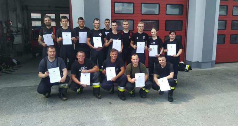 26.06.2022 w Komendzie Powiatowej Państwowej Straży Pożarnej przeprowadzono egzamin kończący kurs jednolity strażaków ratowników Ochotniczych Straży Pożarnych. W kursie udział wzięło 15 osób: 13 druhów i 2 druhny. 10 osób z gminy Białogard, 3 osoby z gminy Karlino i 2 osoby z gminy Tychowo. Strażacy musieli zaliczyć zadania na czterech stacjach: obsługa pilarki i przecinarki, sprawienie i obsługa drabin, narzędzia hydrauliczne połączone z elementami udzielania pierwszej pomocy oraz z rozwinięcia i gaszenia pożarów. Zaliczenia na stacjach nadzorowali strażacy zawodowi z KP PSP Białogard. Po całodziennych zmaganiach ogłoszono oficjalne wyniki. Wszyscy druhowie zaliczyli egzamin z wynikiem pozytywnym. Jest to ogromny sukces kadry szkoleniowej oraz samych druhów, którzy z wielkim zaangażowaniem podeszli do całego kursu.
