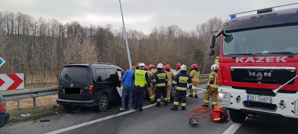 Po dojeździe na miejsce strażacy zabezpieczyli teren zdarzenia i przystąpili do ewakuacji osoby zakleszczonej w jednym z pojazdów. Przy użyciu narzędzi hydraulicznych oraz deski ortopedycznej poszkodowany został bezpiecznie wydobyty i przekazany Zespołowi Ratownictwa Medycznego. Dodatkowo zabezpieczono miejsce wypadku, podając prąd piany ciężkiej oraz odłączono akumulatory w uszkodzonych pojazdach, eliminując ryzyko pożaru.