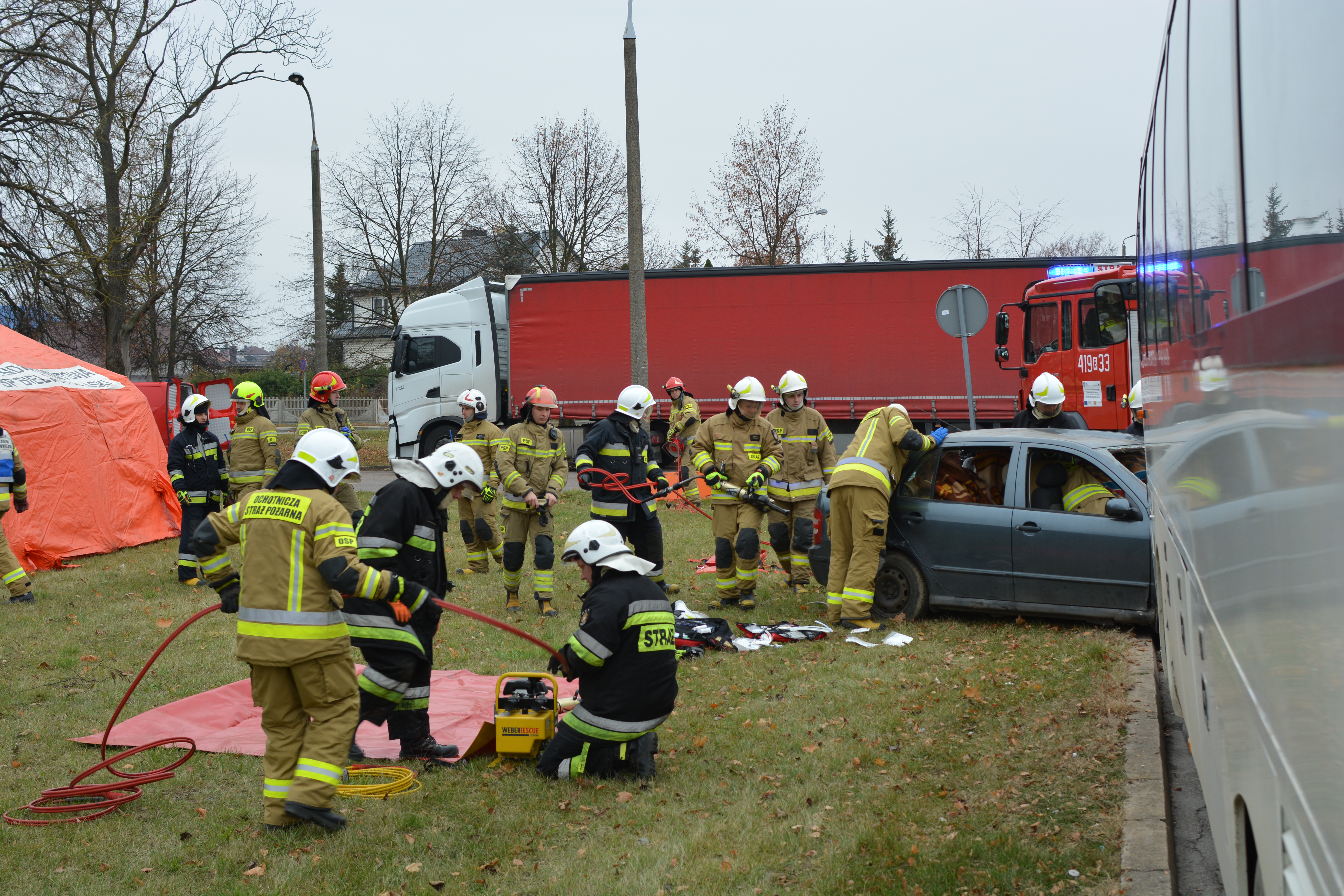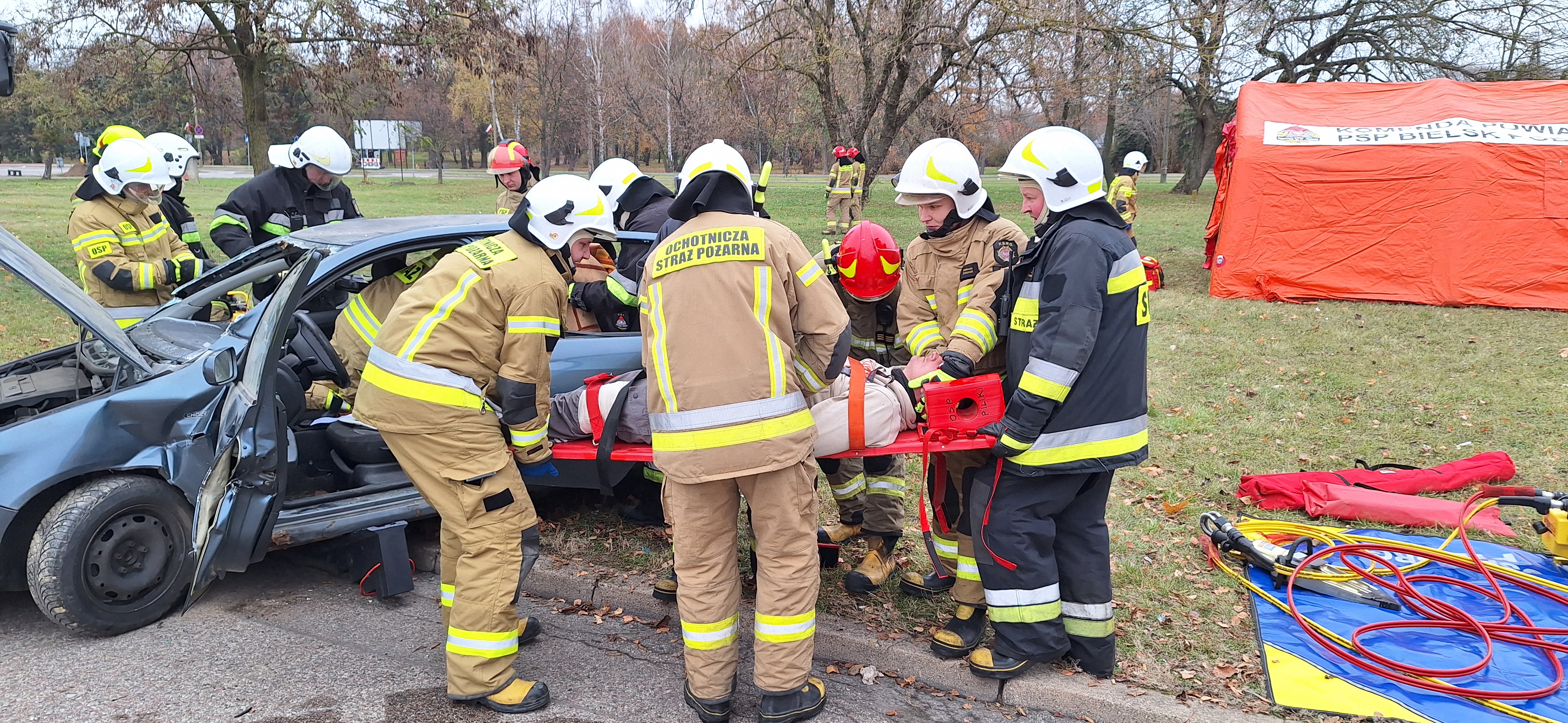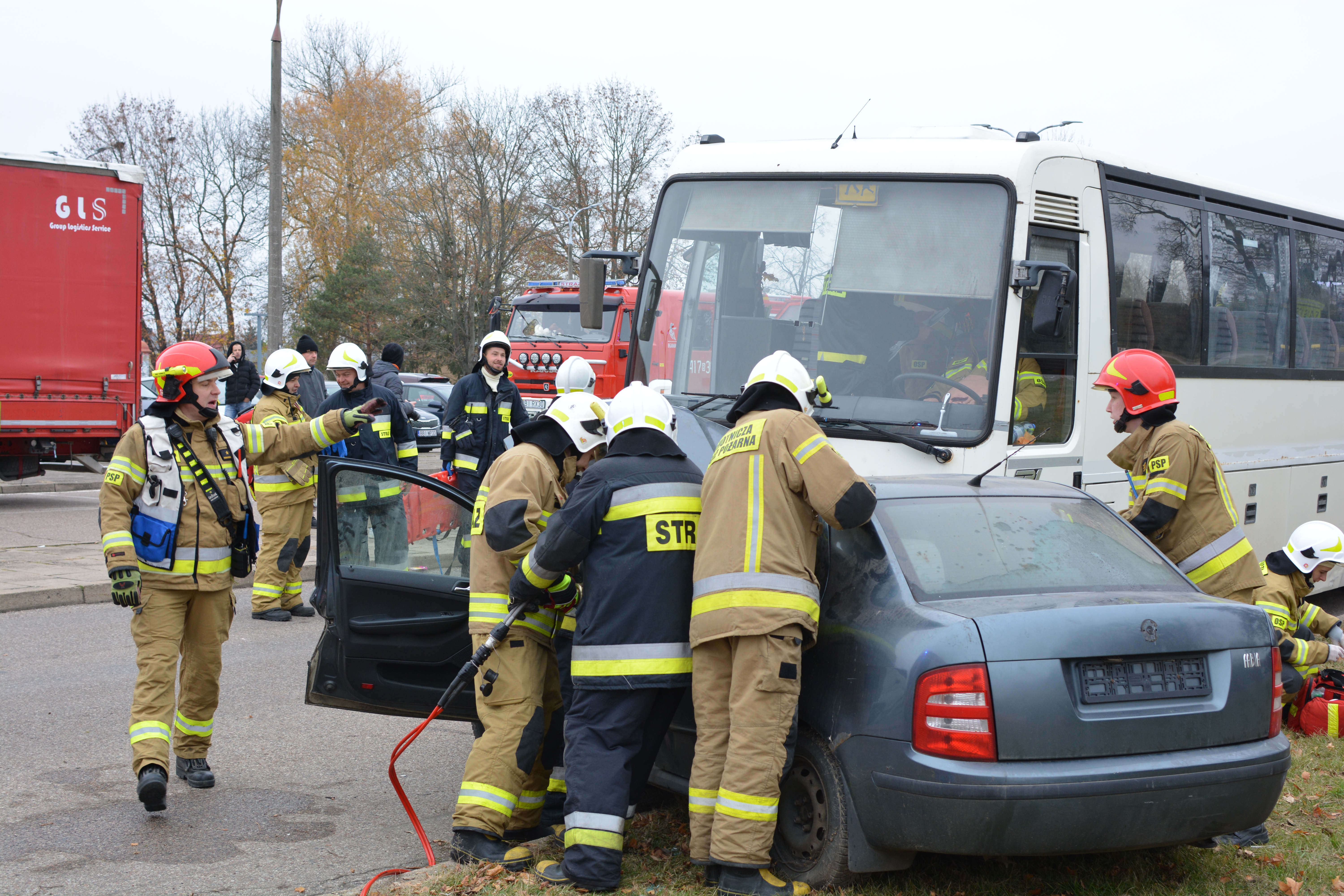 Zderzenia auta osobowego z autobusem - ćwiczenia bielskich strażaków