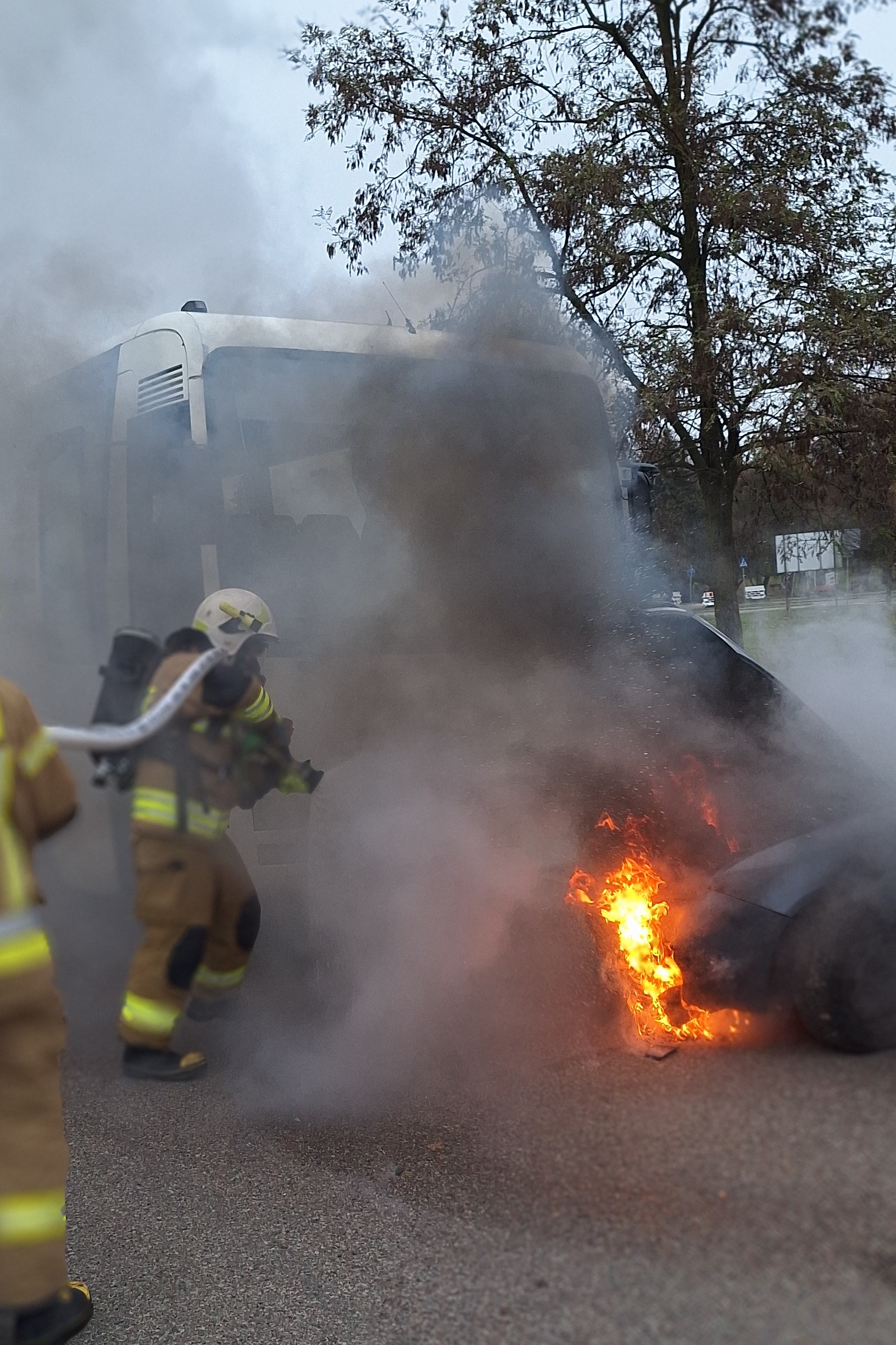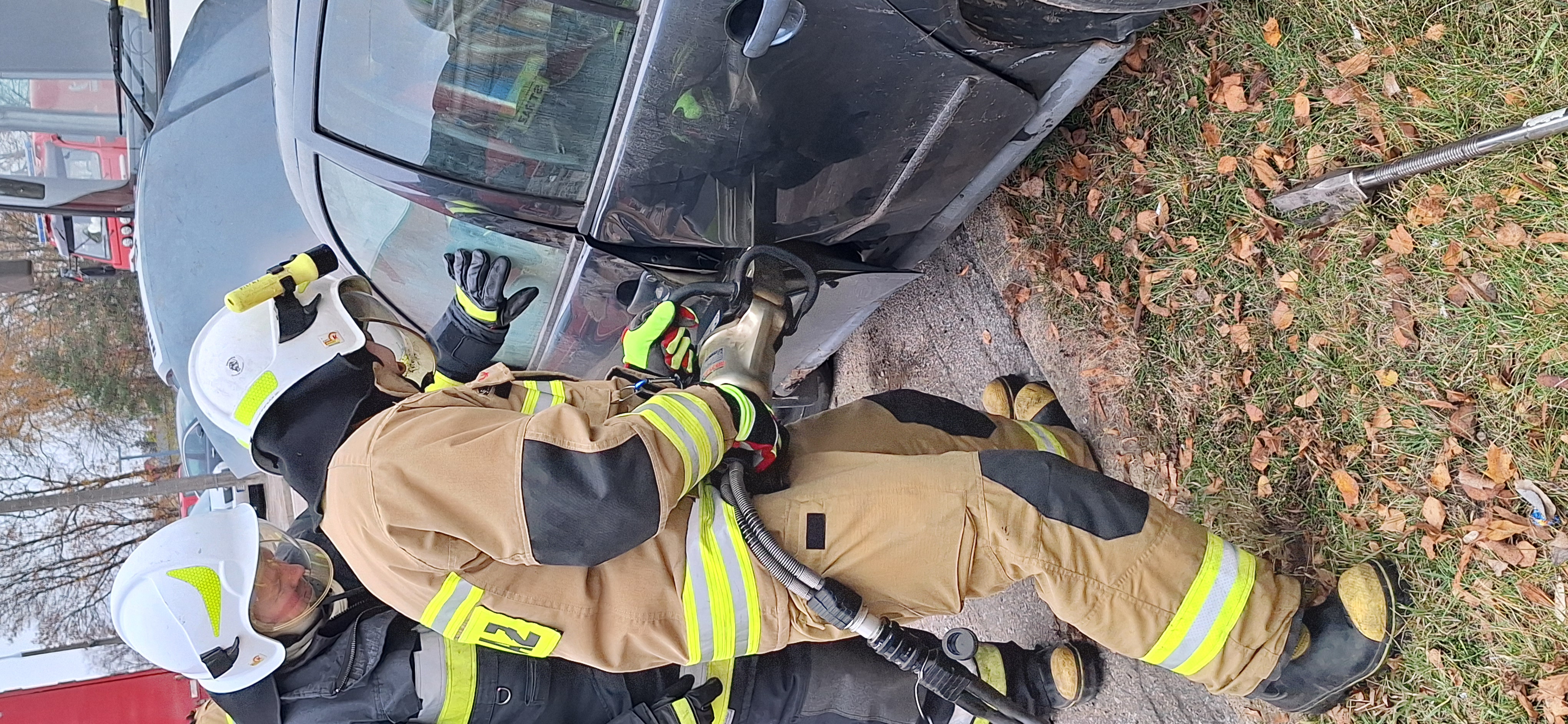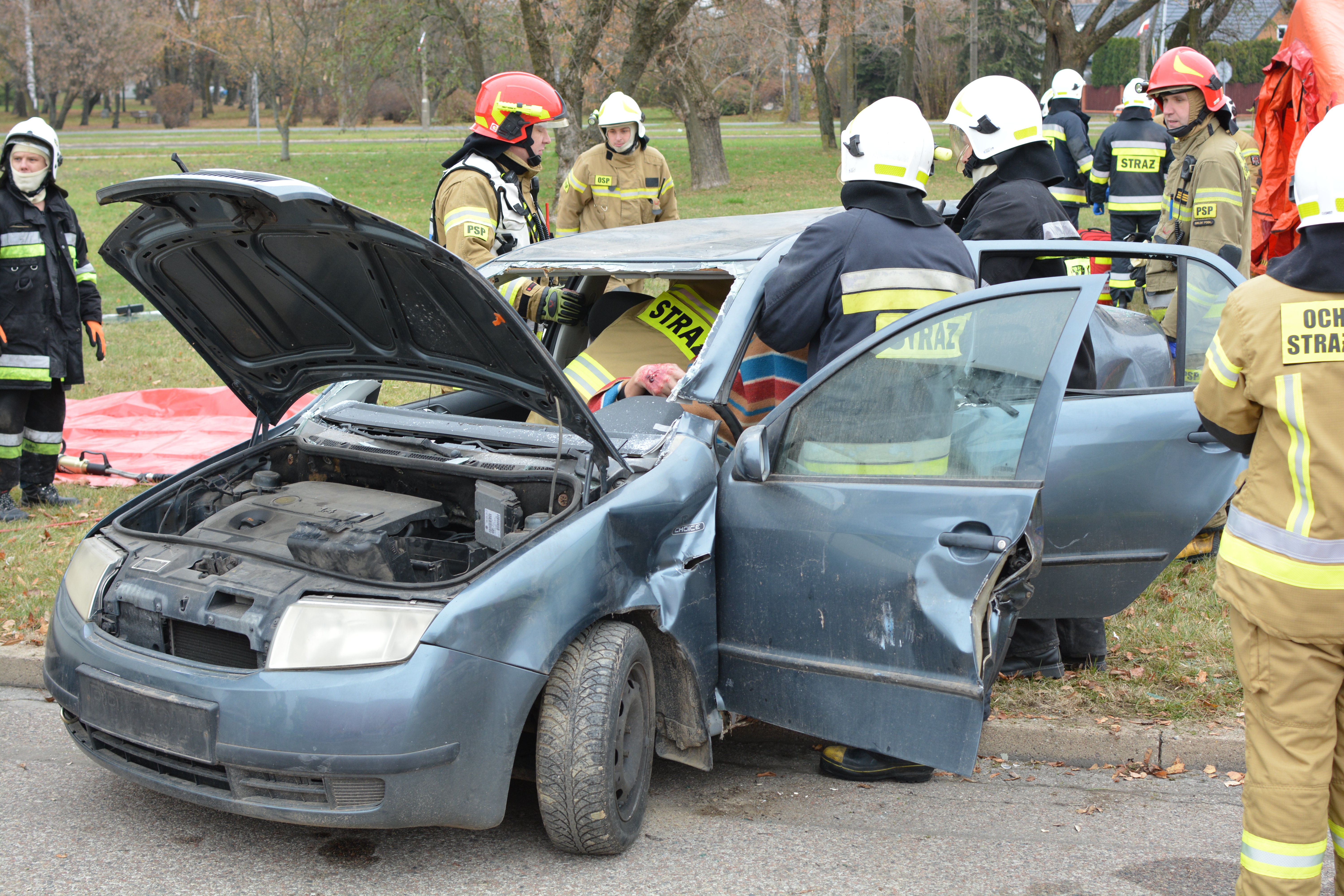 Zderzenia auta osobowego z autobusem - ćwiczenia bielskich strażaków