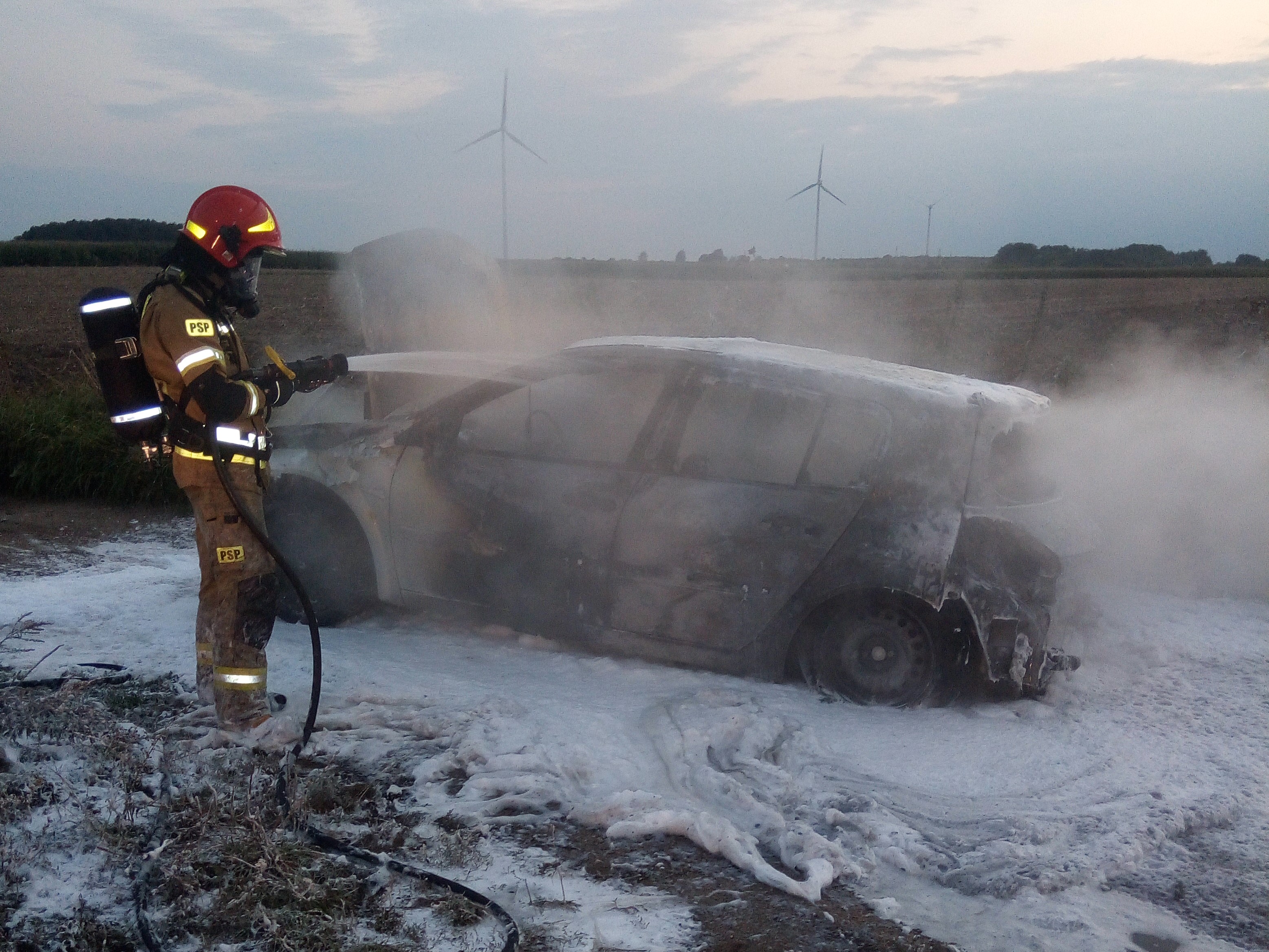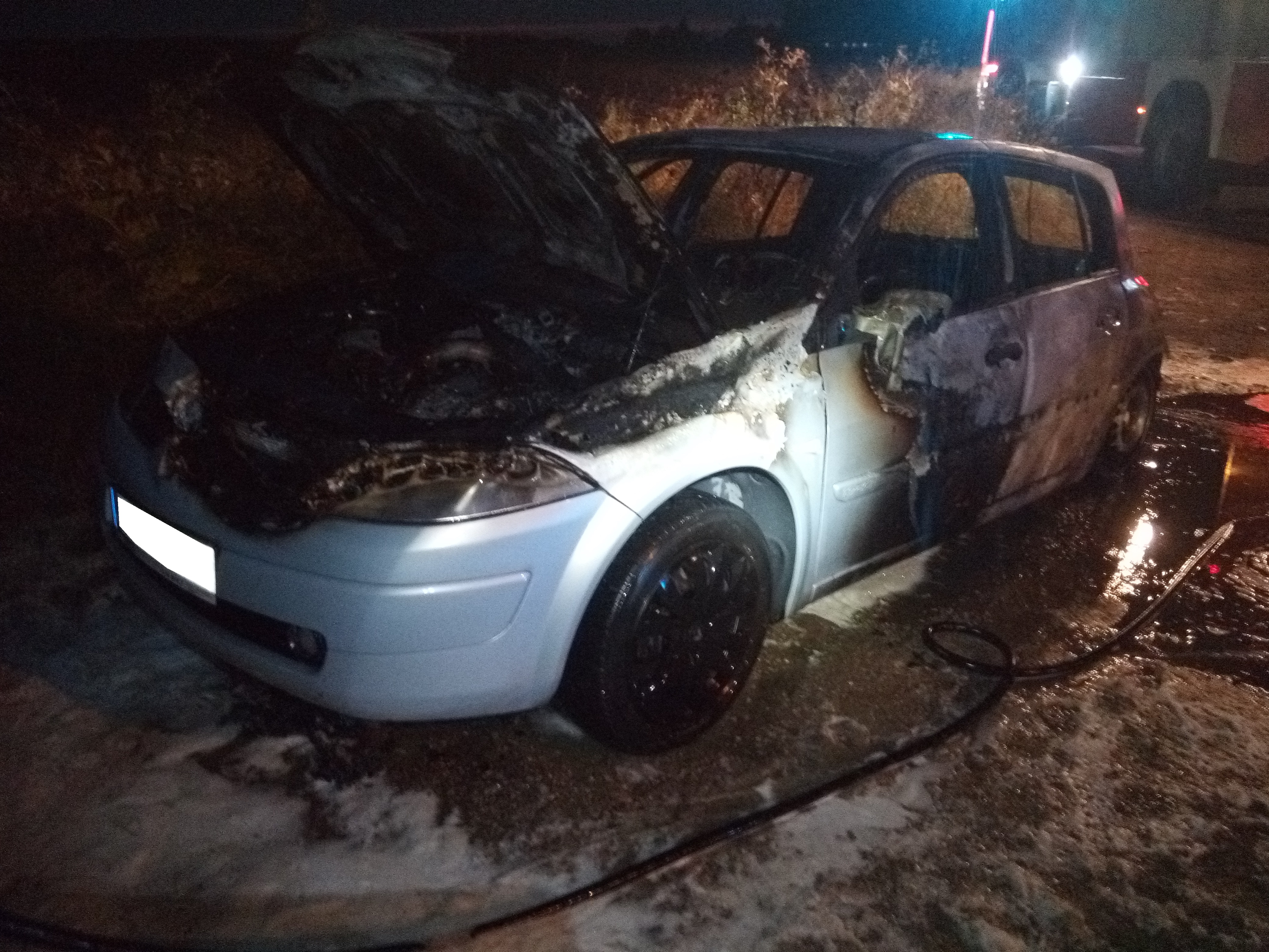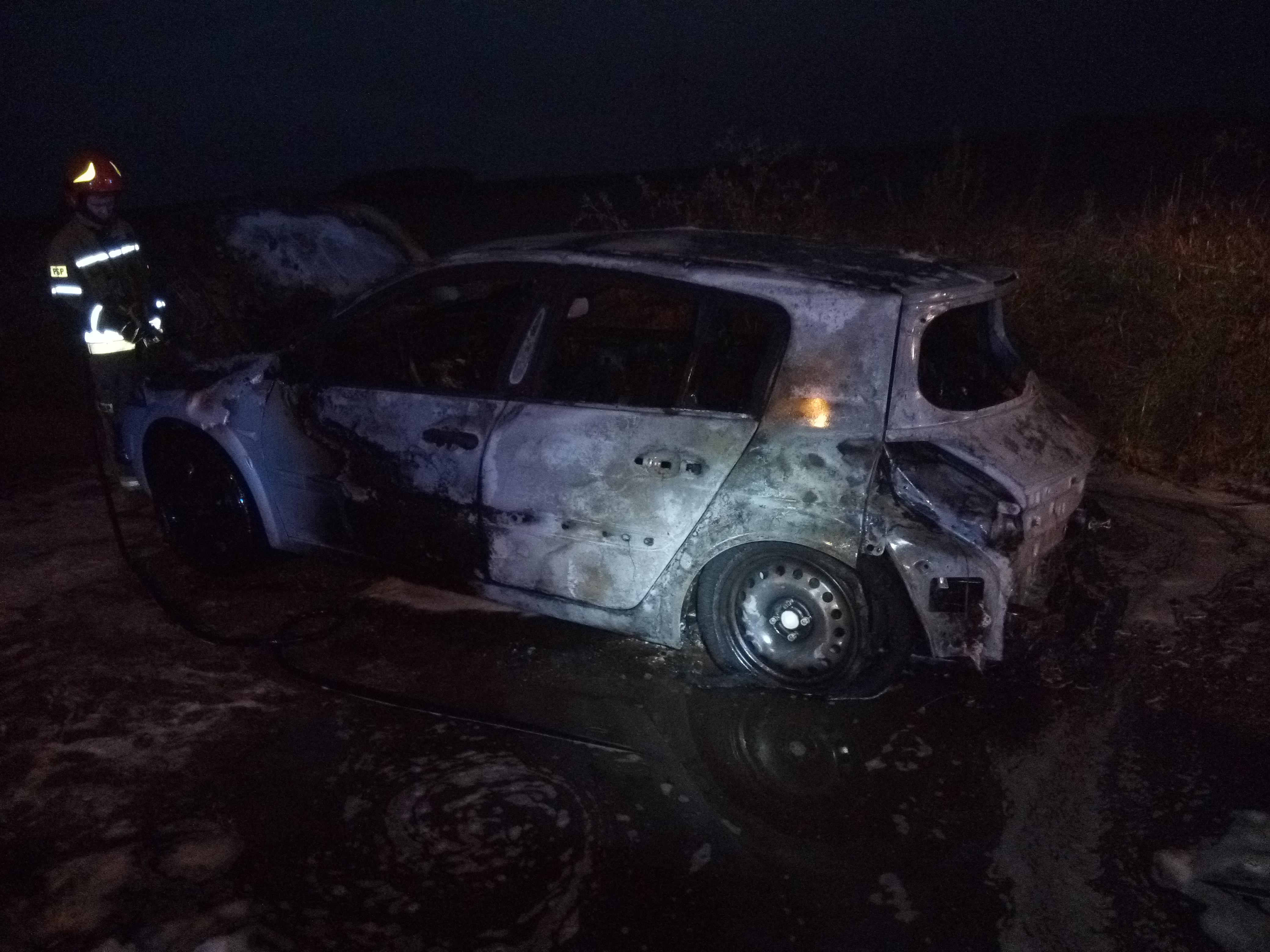 Kiedy zastępy straży pożarnej dotarły na miejsce zdarzenia zastano samochód Renault Megane całkowicie objęty pożarem. Strażacy zabezpieczyli miejsce zdarzenia i przystąpili do gaszenia pożaru przy użyciu piany gaśniczej.
