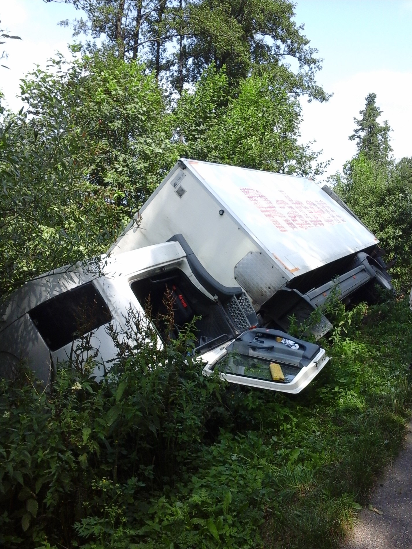 Po przybyciu na miejsce zdarzenia strażacy zastali samochód ciężarowy leżący na boku w przydrożnym rowie. Pojazdem podróżowało 2 osoby. Opuściły one pojazd przed przybyciem służb ratowniczych. Pomocy medycznej osobom biorącym udział w zdarzeniu udzieliła ekipa Zespołu Ratownictwa Medycznego. Oboje po przebadaniu pozostali na miejscu zdarzenia. Strażacy zabezpieczyli miejsce zdarzenia i odłączyli akumulator. W trakcie działań ruch na drodze powiatowej odbywał się wahadłowo.