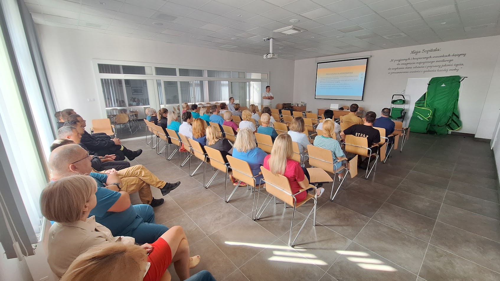 Ćwiczenia rozpoczęły się od części teoretycznej, podczas której strażacy oraz pracownicy szpitala zapoznali się z potencjalnymi zagrożeniami, mogącymi przyczynić się do powstania i rozwoju pożaru w szpitalu. Omówiono także wpływ tych zagrożeń na przebieg akcji ratowniczo-gaśniczych, zasady bezpieczeństwa pożarowego oraz procedury, jakie powinien podjąć personel medyczny w przypadku wystąpienia pożaru. Przedstawiono również scenariusz planowanych ćwiczeń praktycznych.
