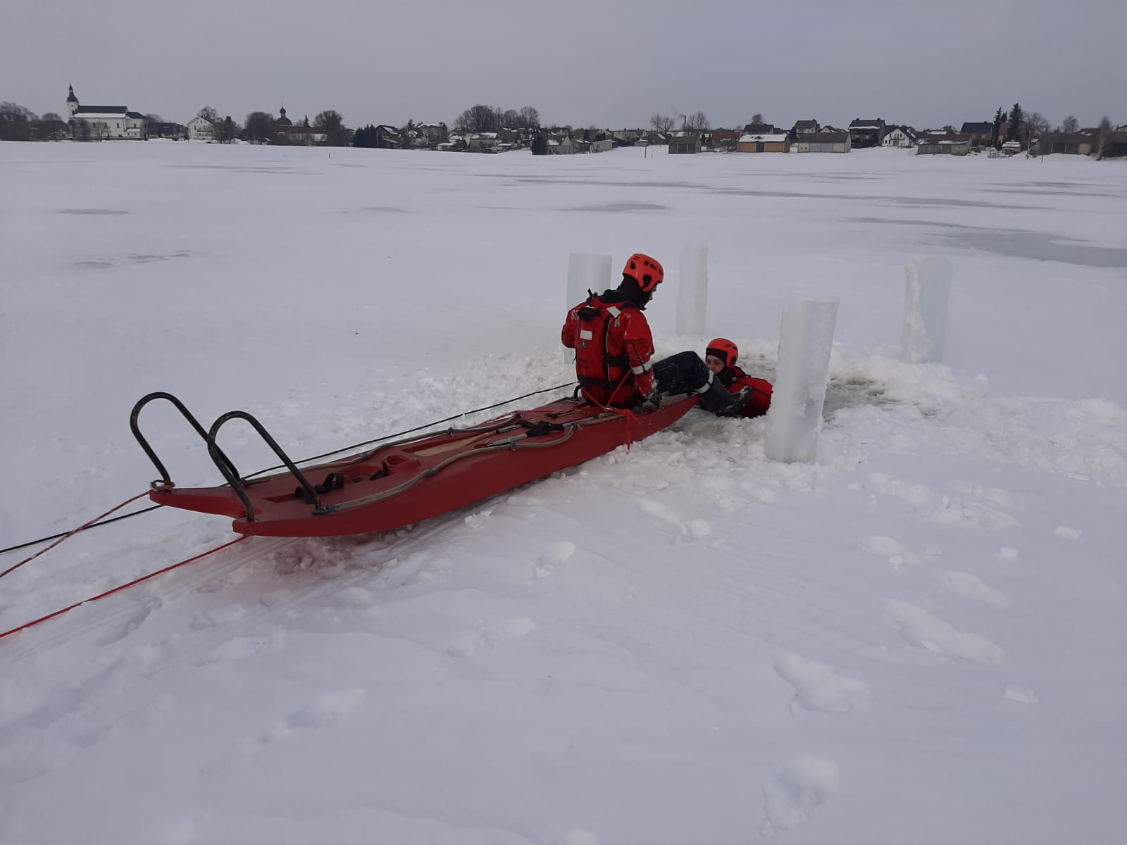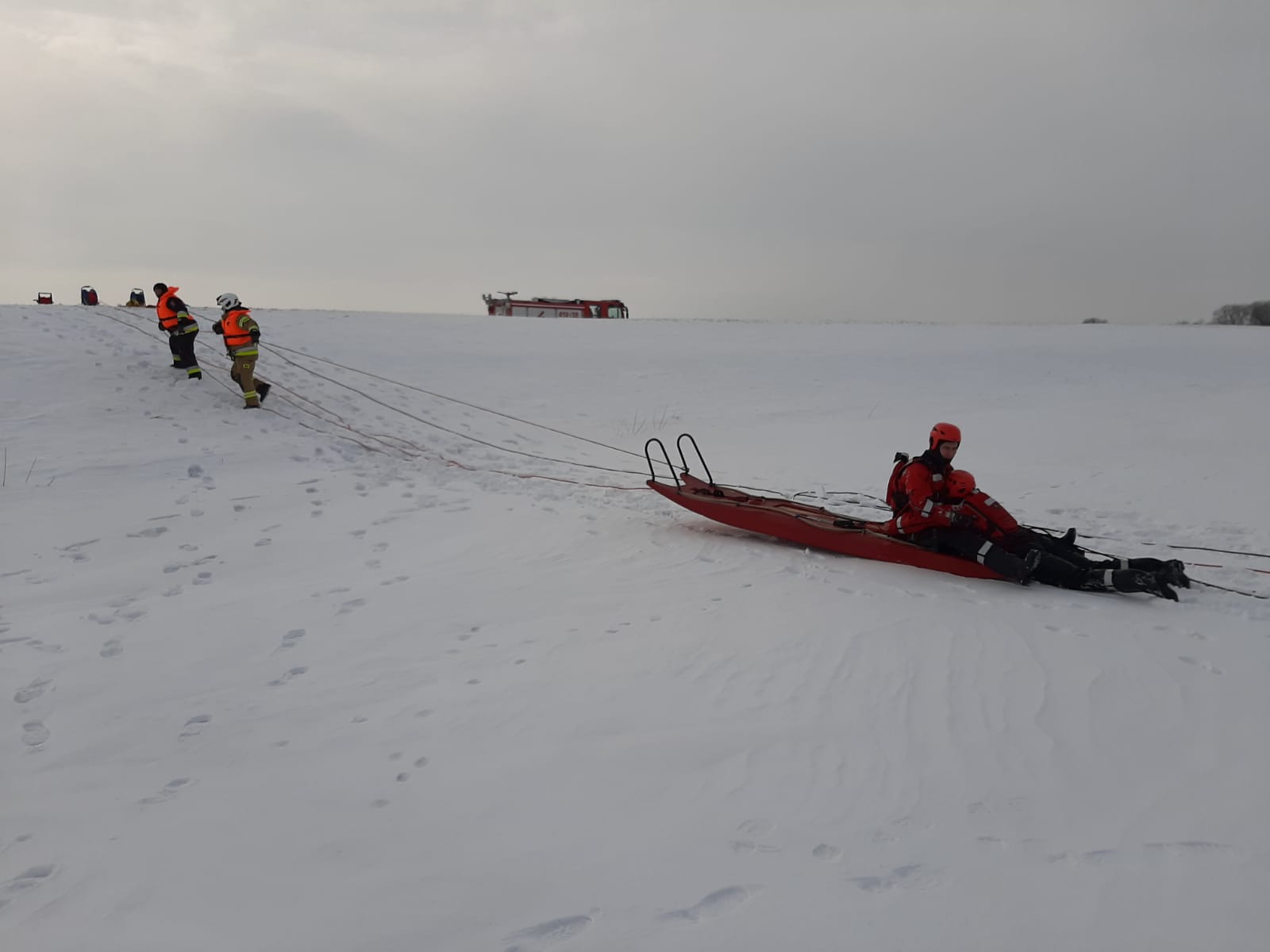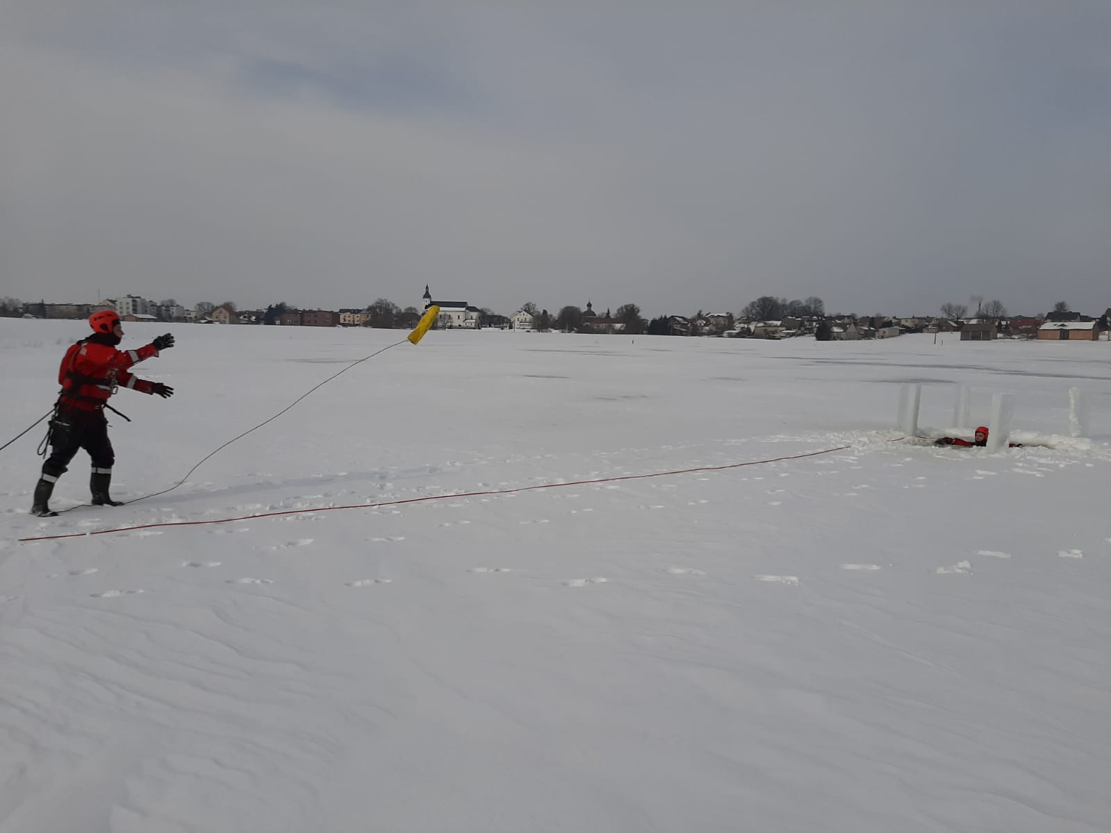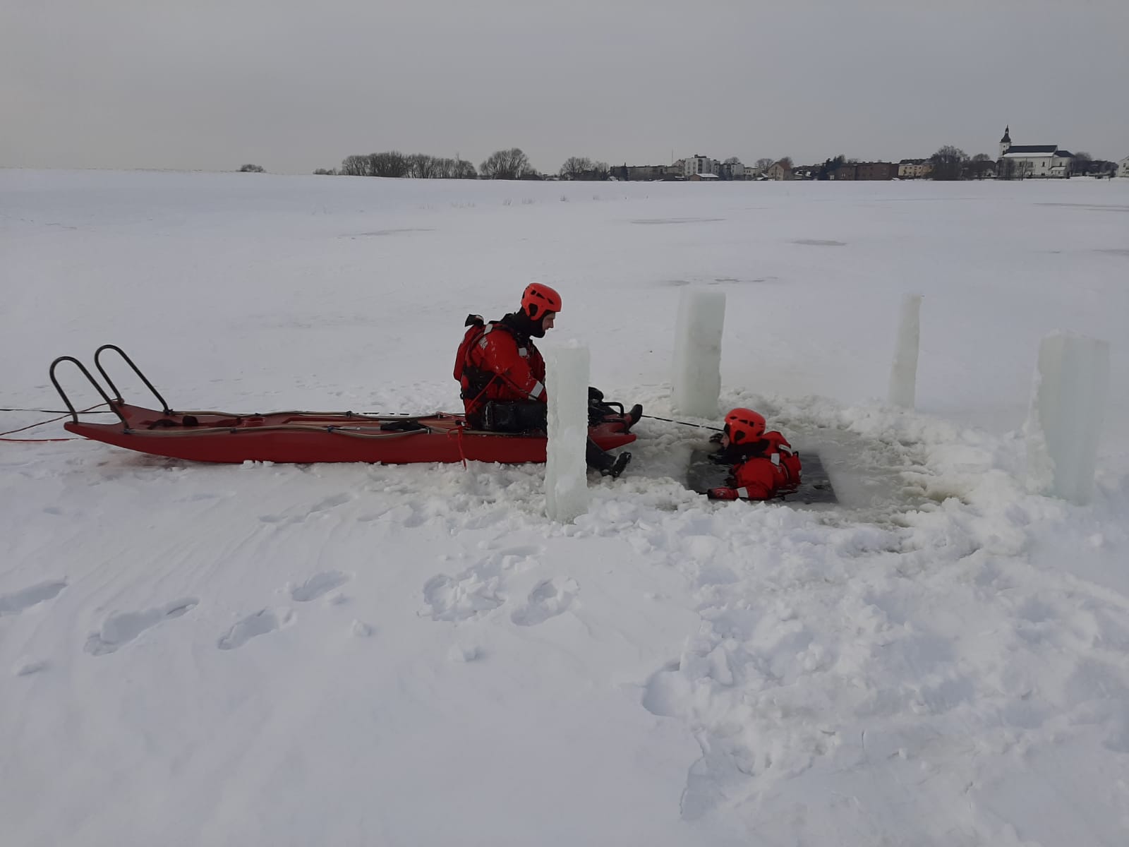 Ćwiczenia z zakresu ratownictwa lodowego na zbiorniku retencyjnym w Brańsku