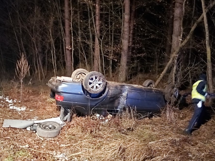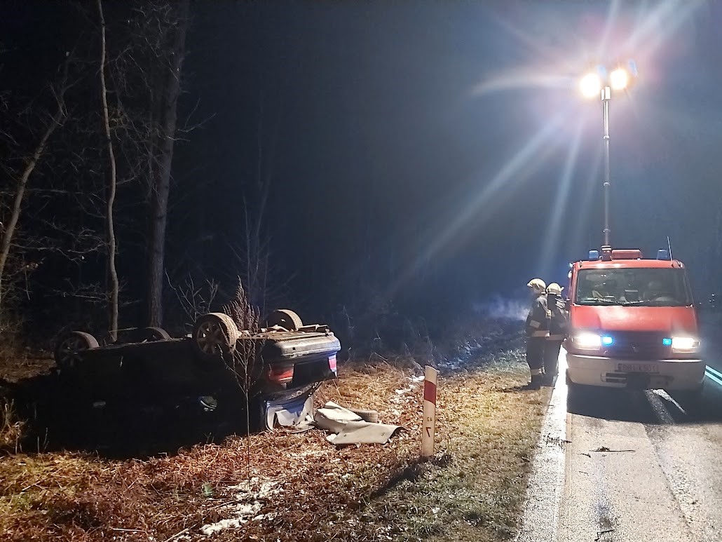 Po przybyciu na miejscu zdarzenia strażacy ustalili, że samochód osobowy marki BMW zjechał z jezdni, uderzył w drzewo i zatrzymał się na dachu na poboczu jezdni. Autem podróżowała jedna osoby. Kierowca opuścił uszkodzony pojazd przed przybyciem zastępów straży pożarnej. Nie doznał on widocznych obrażeń.