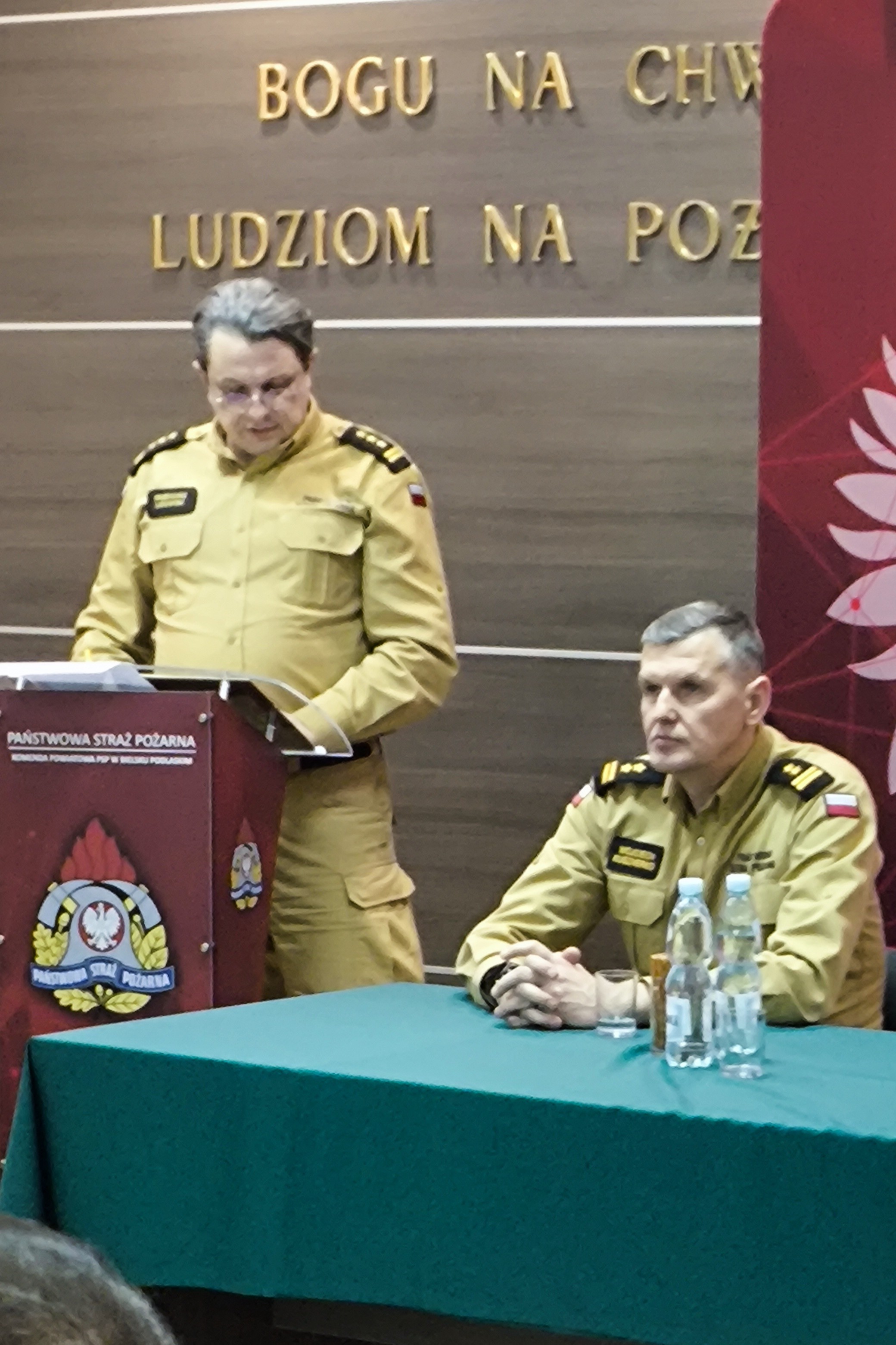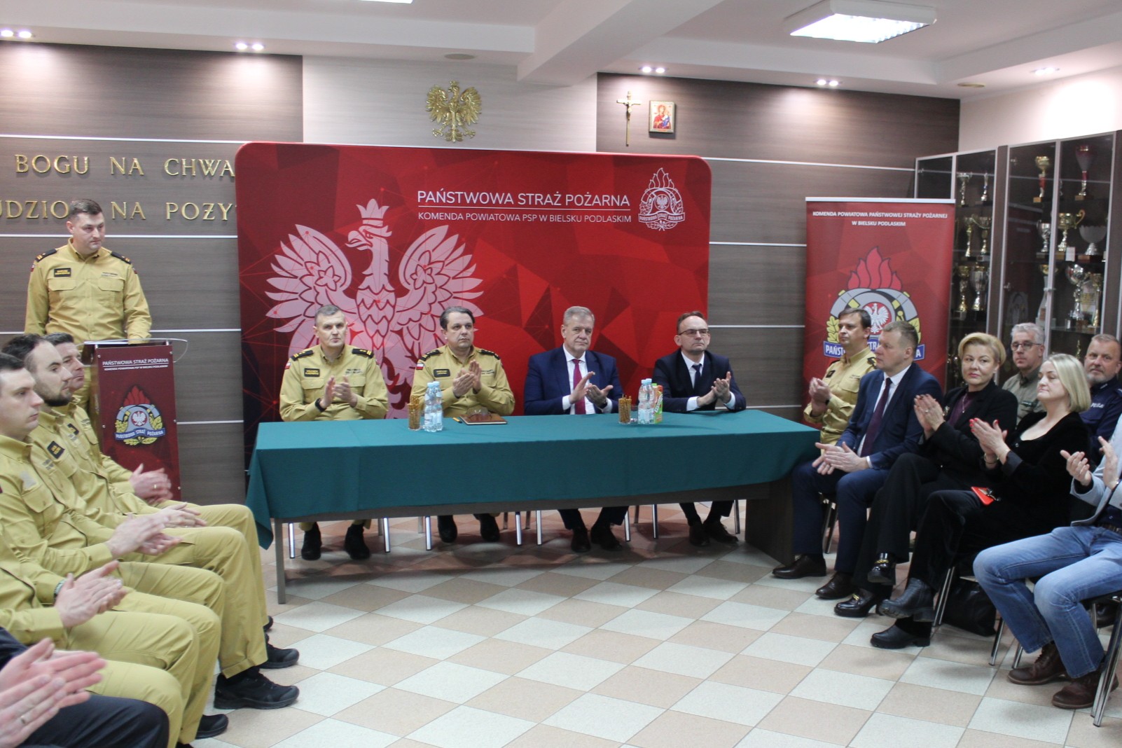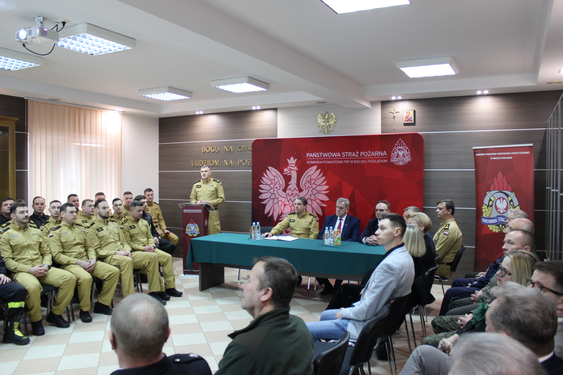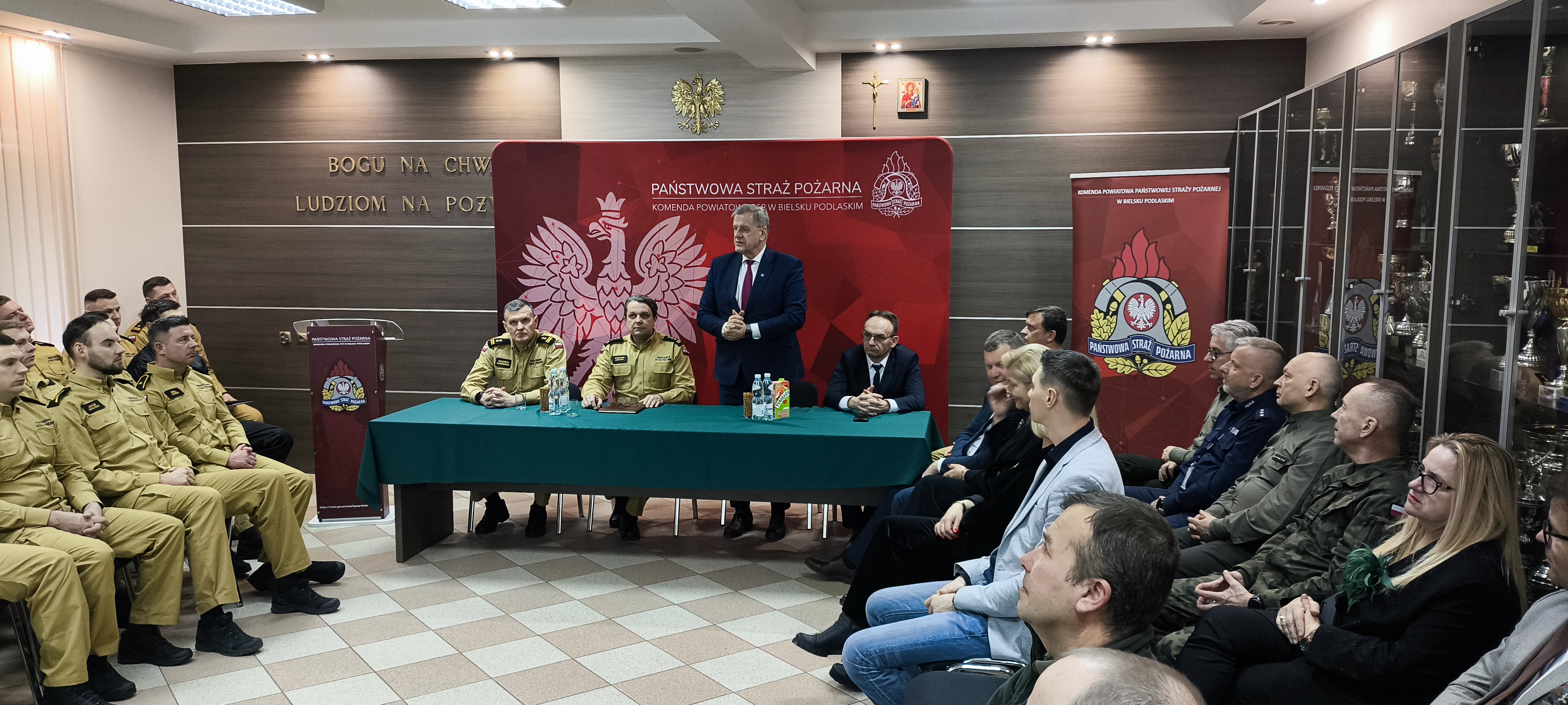Następnie zastępca podlaskiego komendanta wojewódzkiego Państwowej Straży Pożarnej st. bryg. Grzegorz Lisowski podsumował funkcjonowanie ochrony przeciwpożarowej w województwie podlaskim i przedstawił zadania do realizacji w roku bieżącym. Podziękował również wszystkim zaproszonym gościom, władzom samorządowym, strażakom i pracownikom cywilnym za codzienną służbę, wkład i zaangażowanie na rzecz bezpieczeństwa lokalnej społeczności.