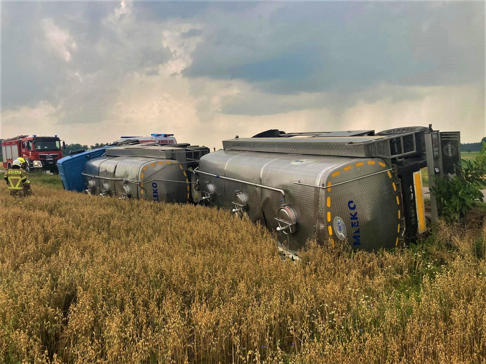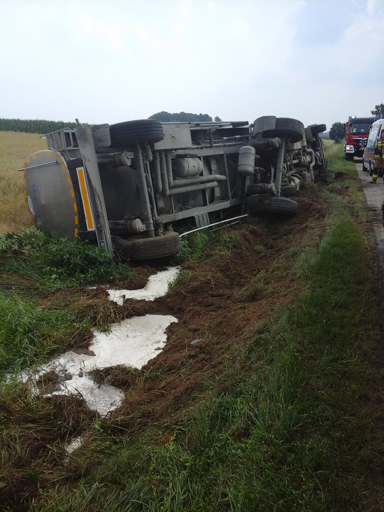 W chwili przybycia straży pożarnej na miejsce zdarzenia zastano samochód ciężarowy marki Volvo FH12 z przyczepą do przewozu mleka leżący na boku w rowie drogi powiatowej. Kierujący pojazdem opuścił go przed przybyciem służb ratunkowych. Ze zbiorników wyciekło do pobliskiego rowu ok 23000 litrów mleka. Działania strażaków polegały na zabezpieczeniu miejsca zdarzenia. Zespół Ratownictwa Medycznego przebadał kierowcę, z uwagi na brak obrażeń pozostawił na miejscu zdarzenia.