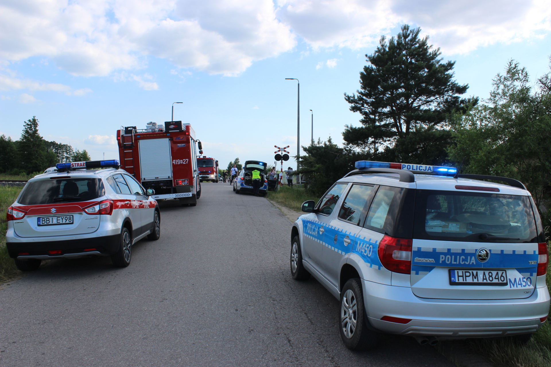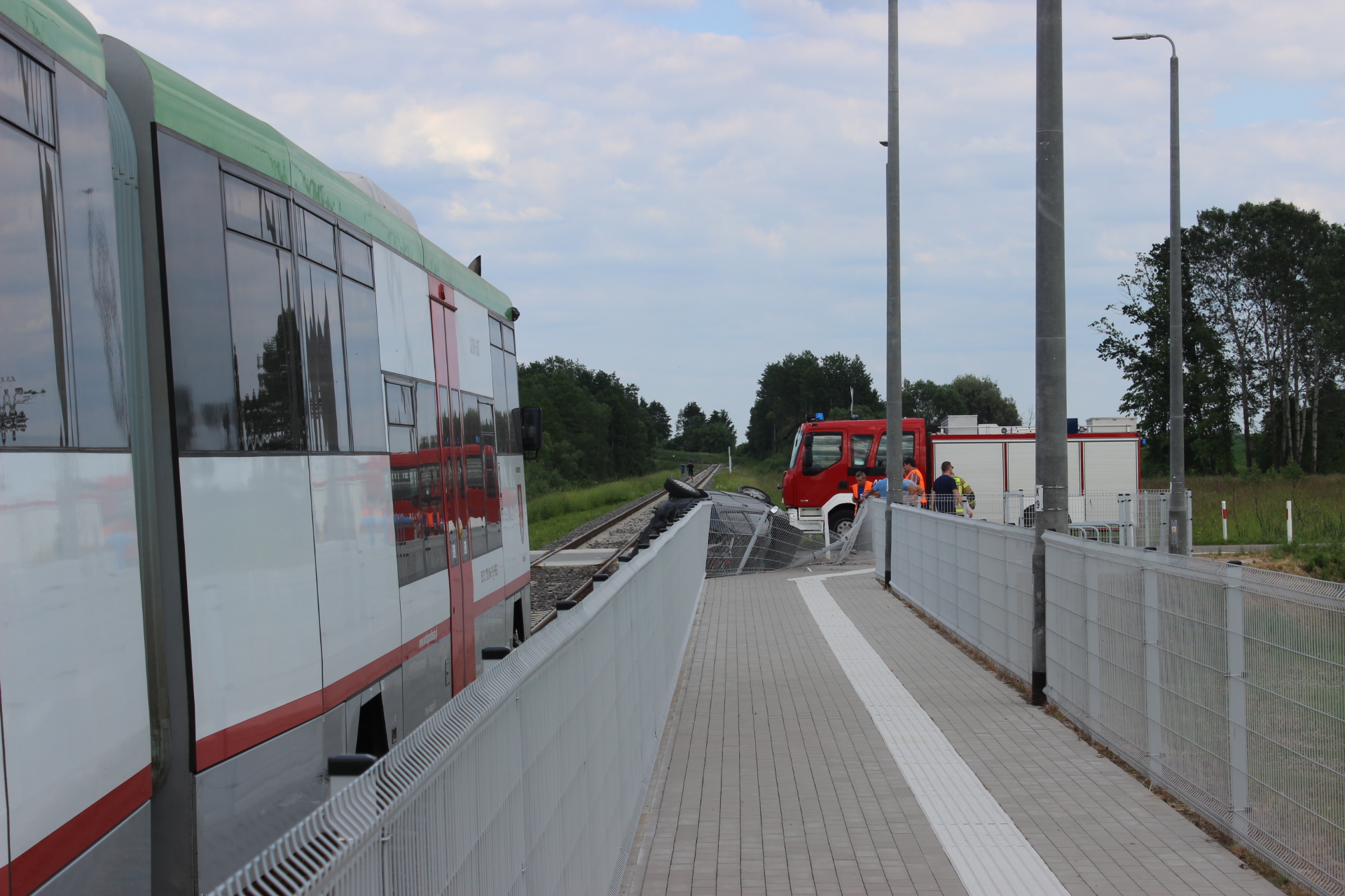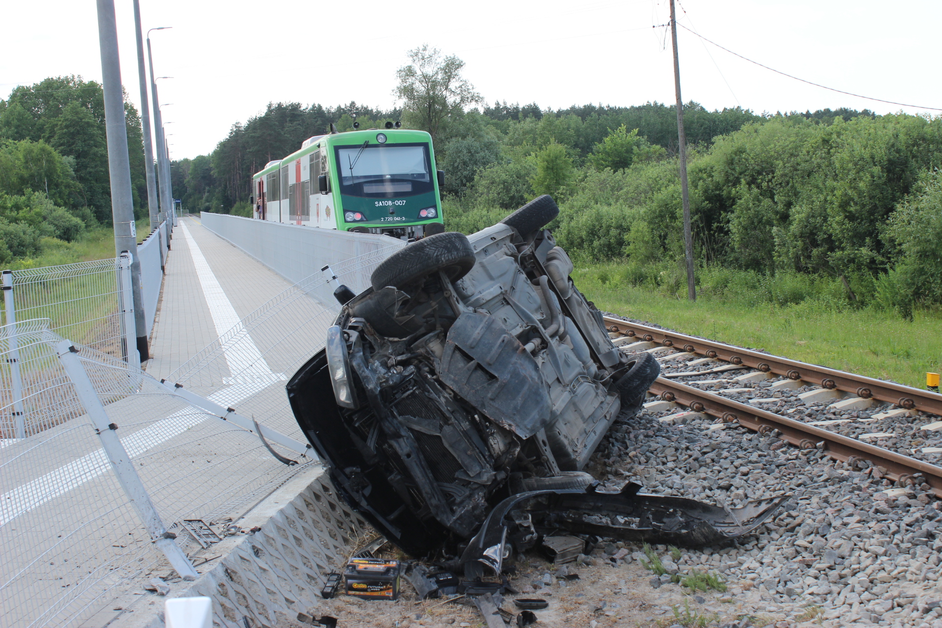 W chwili przybycia zastępów straży pożarnej na miejsce zdarzenia, zastano samochód osobowy leżący na boku obok przejazdu kolejowego po zderzeniu z szynobusem stojącym w odległości ok. 15 m od miejsca zderzenia. Na szczęście nie doszło do wykolejenia pojazdu szynowego. Autem podróżował jedynie kierowca – opuścił on pojazd o własnych siłach przed przybyciem służb ratunkowych. Szynobusem podróżowało 11 osób, nikt nie odniósł obrażeń.