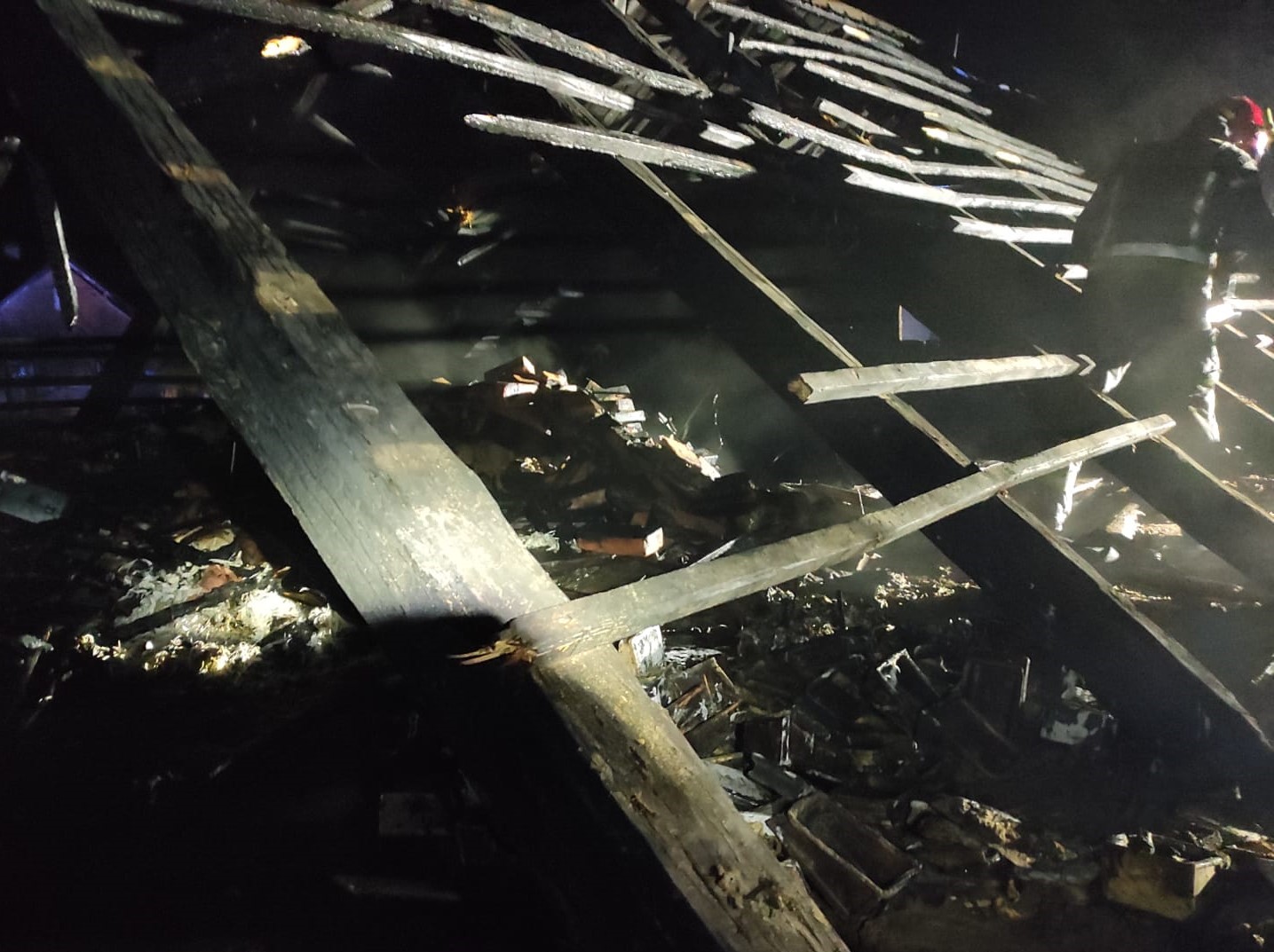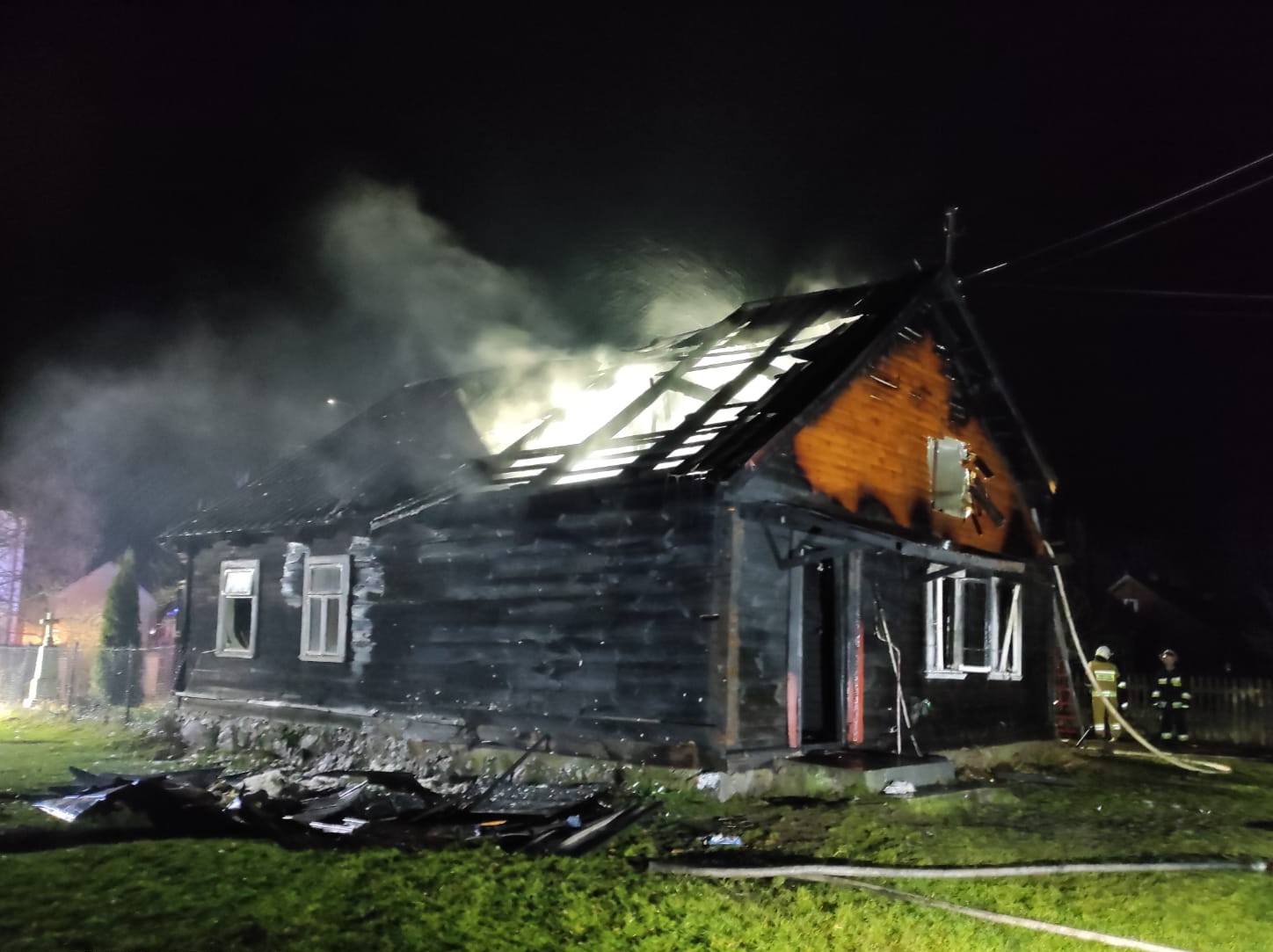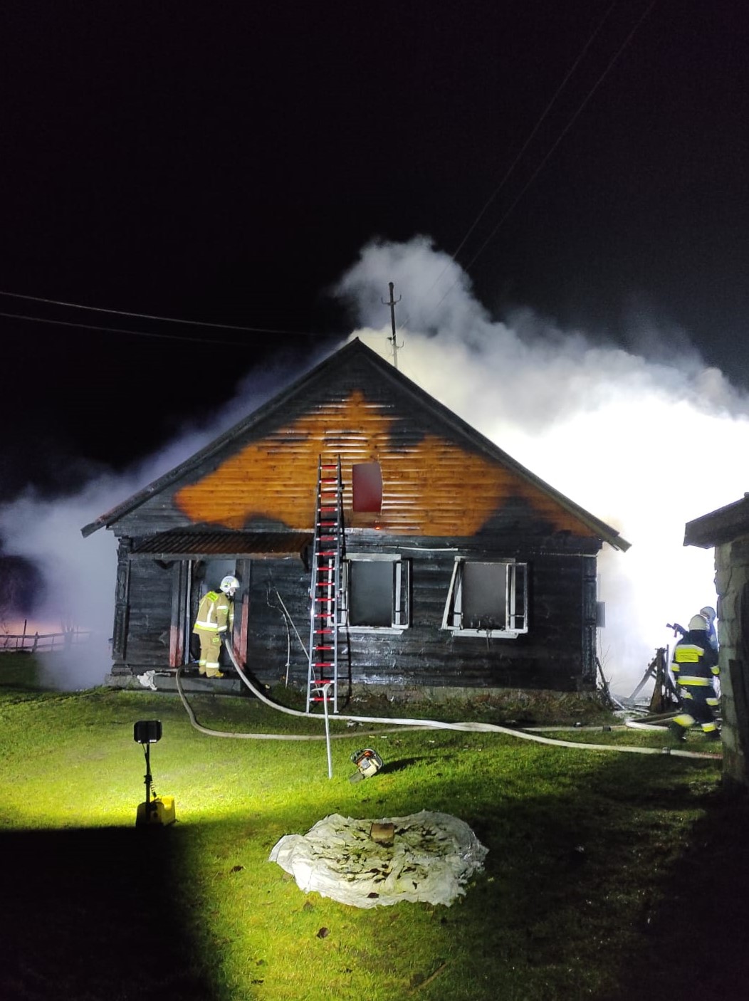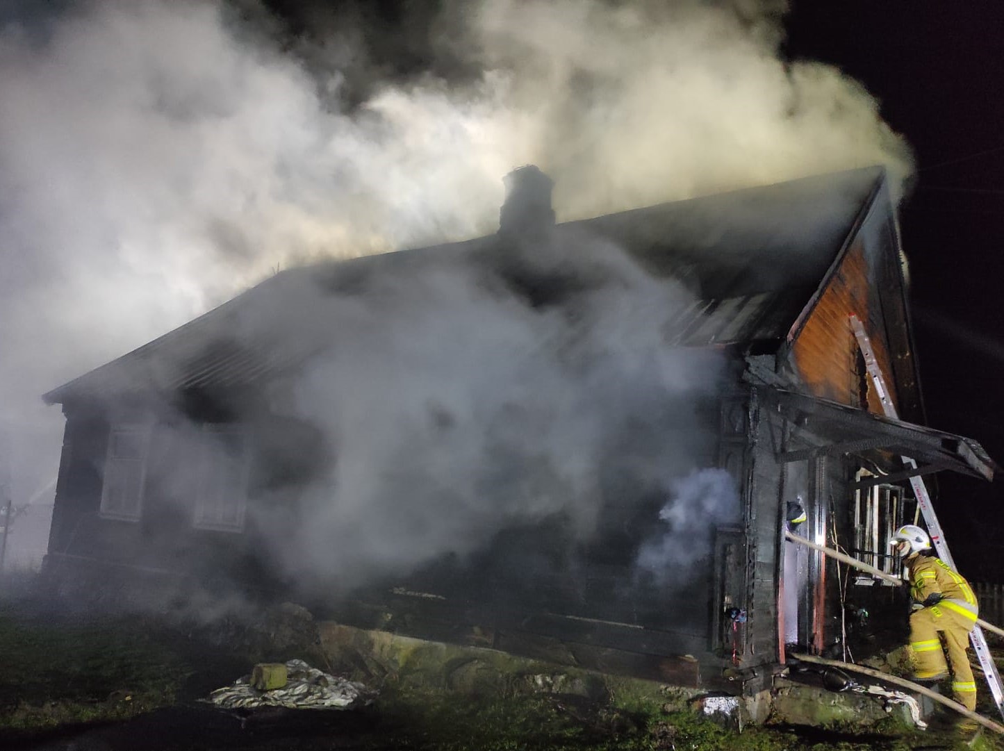Kiedy ratownicy dotarli na miejsce zdarzenia stwierdzono rozwinięty pożar drewnianego budynku mieszkalnego jednorodzinnego. Mieszkańcy opuścili budynek przed przybyciem straży pożarnej. Działania strażaków polegały na podaniu dwóch prądów wody do wewnątrz budynku, oraz dwóch prądów wody na poddasze. Po ugaszeniu ognia przystąpiono do usuwania spalonych elementów konstrukcyjnych dachu, ścian, podłogi, stropu i elementów wyposażenia. Temperaturę budynku kontrolowano kamerą termowizyjną w celu wyeliminowania ukrytych ognisk pożaru.