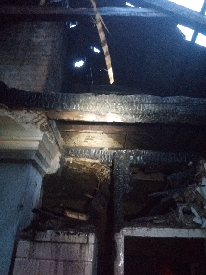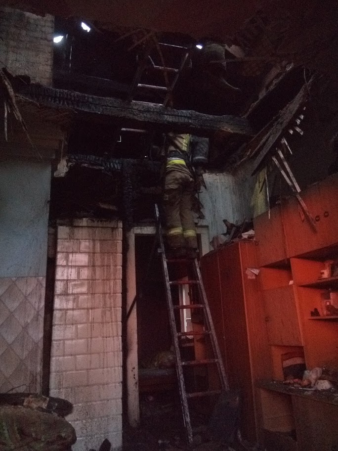 W chwili przybycia jednostek straży pożarnej na miejscu zdarzenia zastano pożar murowanego budynku mieszkalnego. Pożarem objęty był strop i ściana w dwóch pomieszczeniach, w których znajdował się piec kaflowy. Działania JOP polegały na zabezpieczeniu miejsca zdarzenia, a następnie ugaszeniu pożaru poprzez podanie prądu wody na płonące elementy budynku.