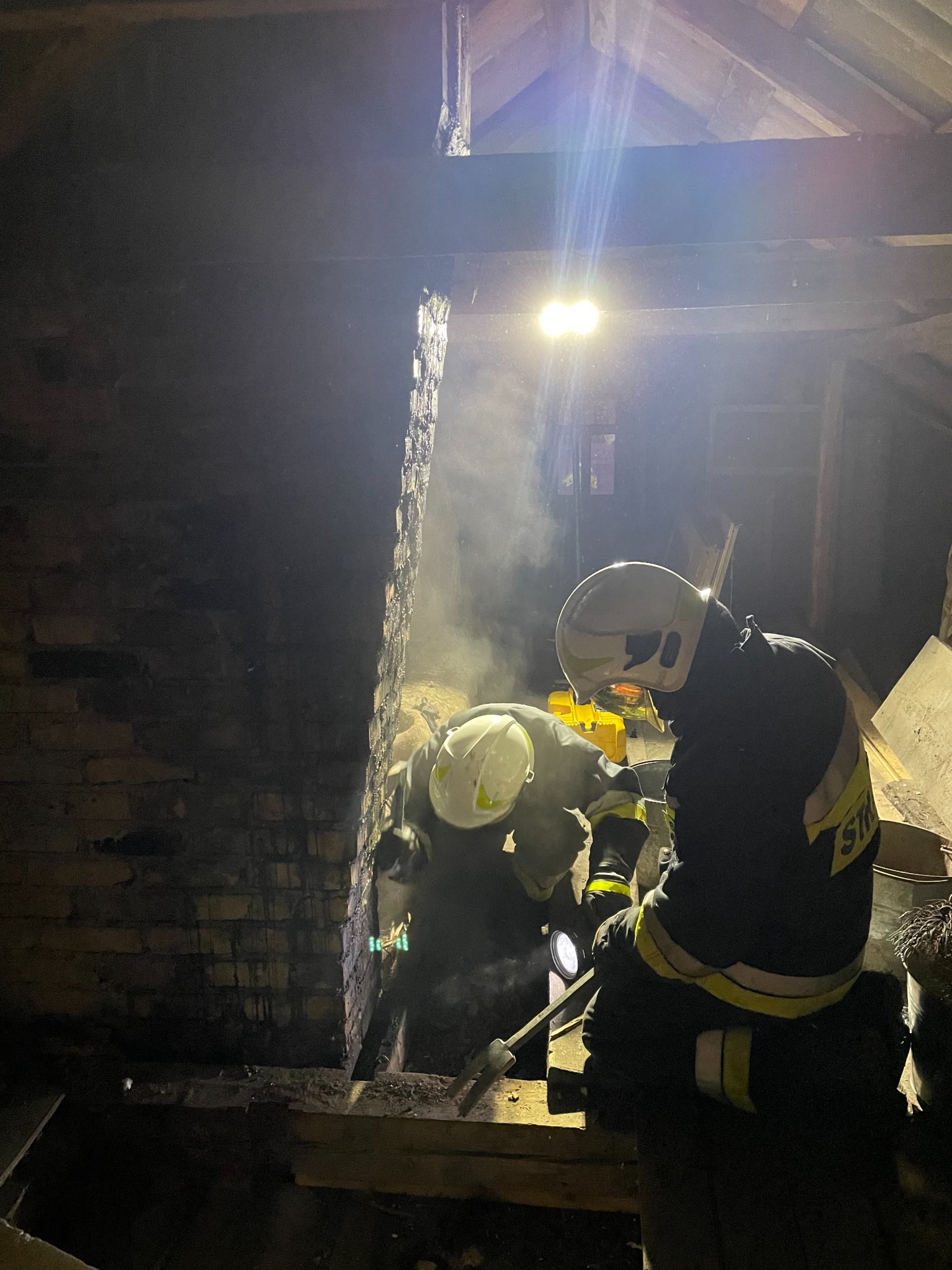 Strażacy zabezpieczyli miejsce zdarzenia i przystąpili do gaszenia pożaru przy użyciu lancy gaśniczej. Działania gaśnicze prowadzono zarówno z poziomu piwnicy, przez wyczystkę, jaki i na poddaszu. W wyniku pożaru nadpaleniu uległy drewniane belki stropowe biegnące przy kominie. Ukryte zarzewia ognia lokalizowano przy pomocy kamery termowizyjnej. Tlące się drewniane elementy konstrukcyjne wycinano pilarką ratowniczą oraz gaszono przy użyciu lancy gaśniczej. Po ugaszeniu pożaru oraz przewietrzeniu pomieszczeń cały budynek sprawdzono kamerą termowizyjną oraz czujnikiem wielogazowym.