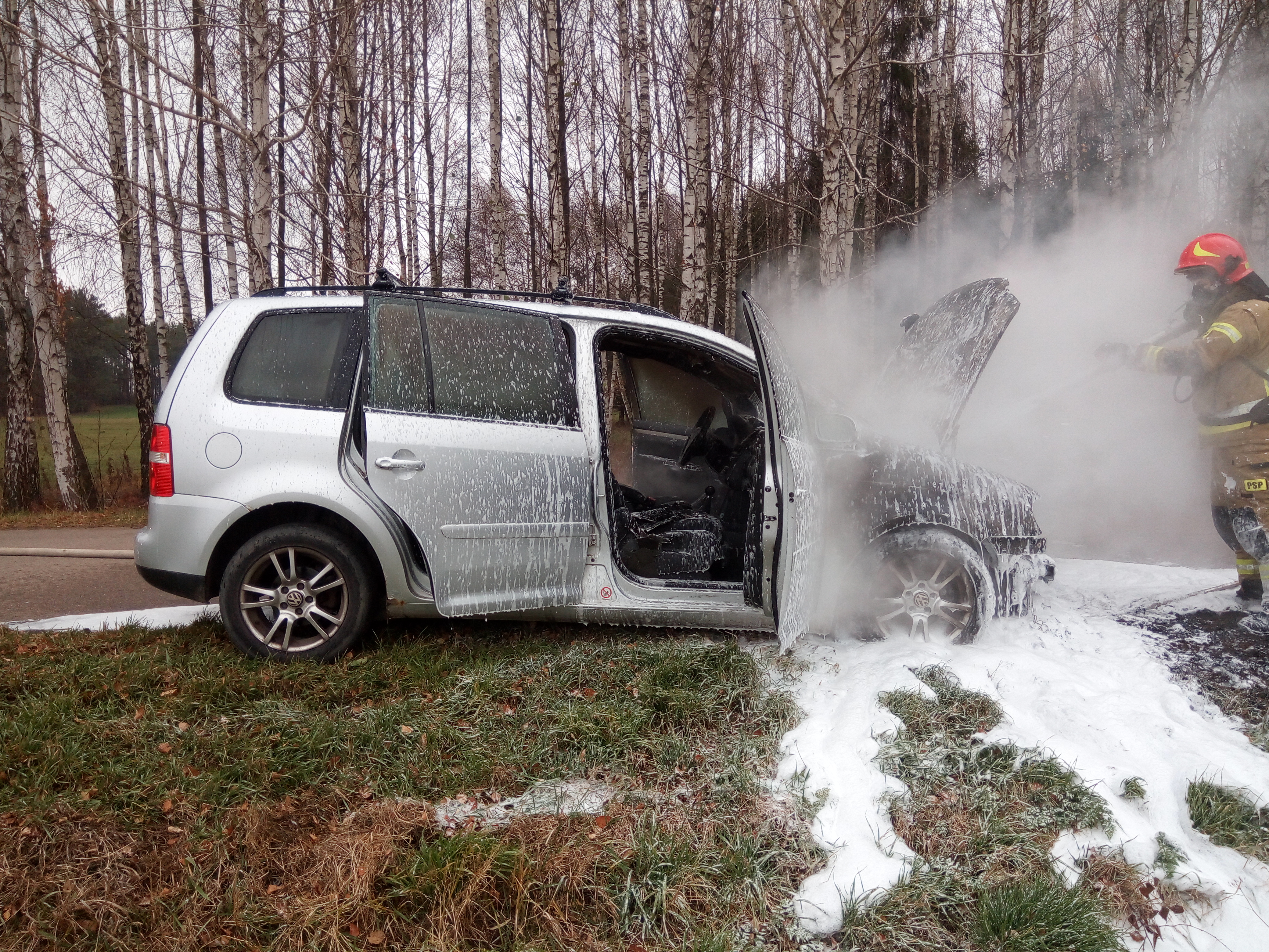 Kiedy ratownicy dotarli na miejsce zdarzenia stwierdzono, że pożarem objęta jest komora silnika oraz deska rozdzielcza samochodu osobowego VW Touran stojącego na poboczu drogi gminnej. Kierowca opuścił pojazdy przed przybyciem zastępu straży pożarnej.
