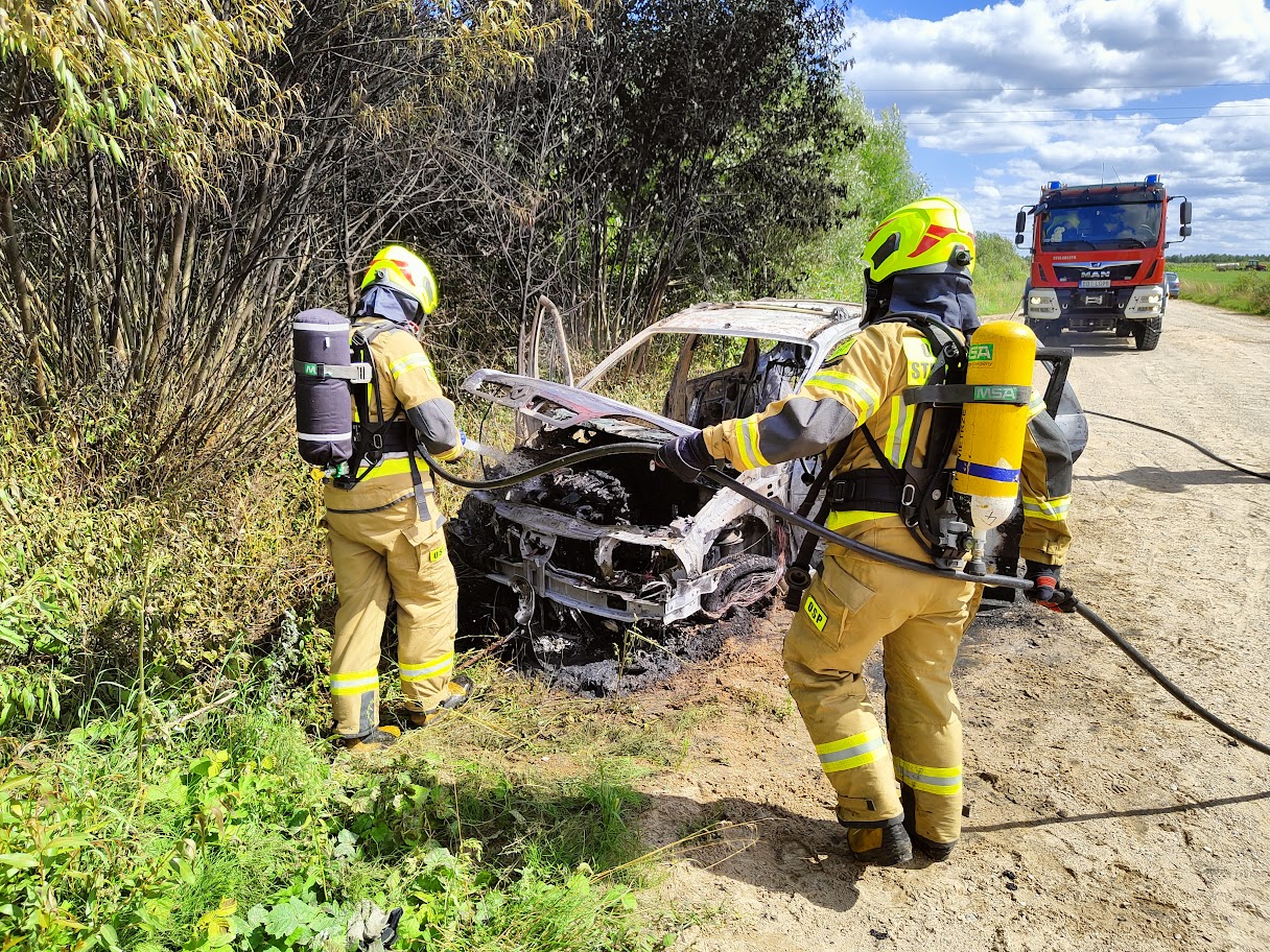 Działania zastępów polegały na zabezpieczeniu miejsca zdarzenia i ugaszeniu płonącego pojazdu poprzez podanie jednego prądu wody.
