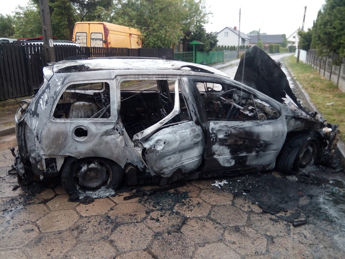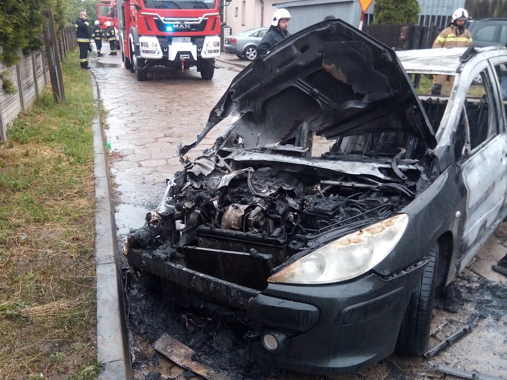 Kiedy zastępy straży pożarnej dotarły na miejsce zdarzenia zastano samochód osobowy Peugeot 307 całkowicie objęty pożarem. Kierowca zdołał bezpiecznie opuścić pojazd. Strażacy zabezpieczyli miejsce zdarzenia i przystąpili do gaszenia palącego się auta. W wyniku zdarzenia jedna osoba doznała niegroźnego oparzenia dłoni, strażacy udzielili jej kwalifikowanej pierwszej pomocy.