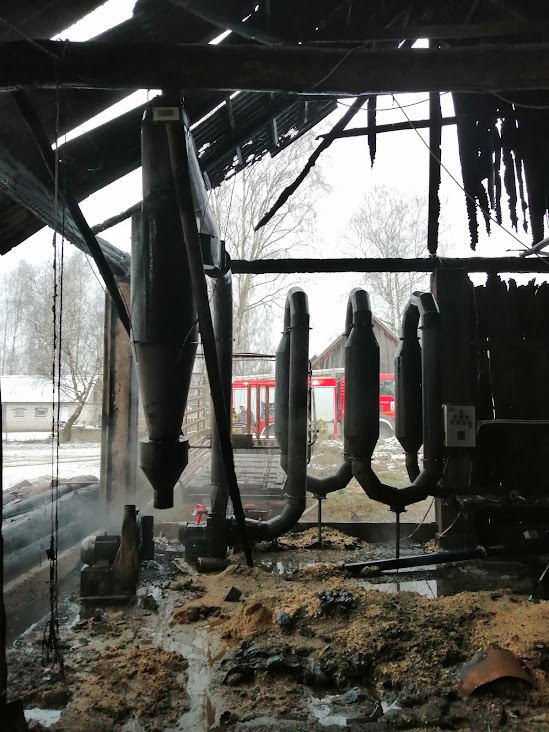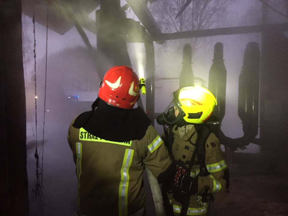 Kiedy strażacy dotarli na miejsce zdarzenia stwierdzono, że pożarem objęta jest ściana szczytowa, część więźby dachowej oraz ściana zewnętrzna budynku. Budynek zaadoptowany był na suszarnię do trocin. Strażacy zabezpieczyli miejsce zdarzenia i przystąpili do działań gaśniczych, podając dwa prądy wody w natarciu na pożar. Przy pomocy kamery termowizyjnej kontrolowano temperaturę elementów konstrukcyjnych budynku oraz suszarni.