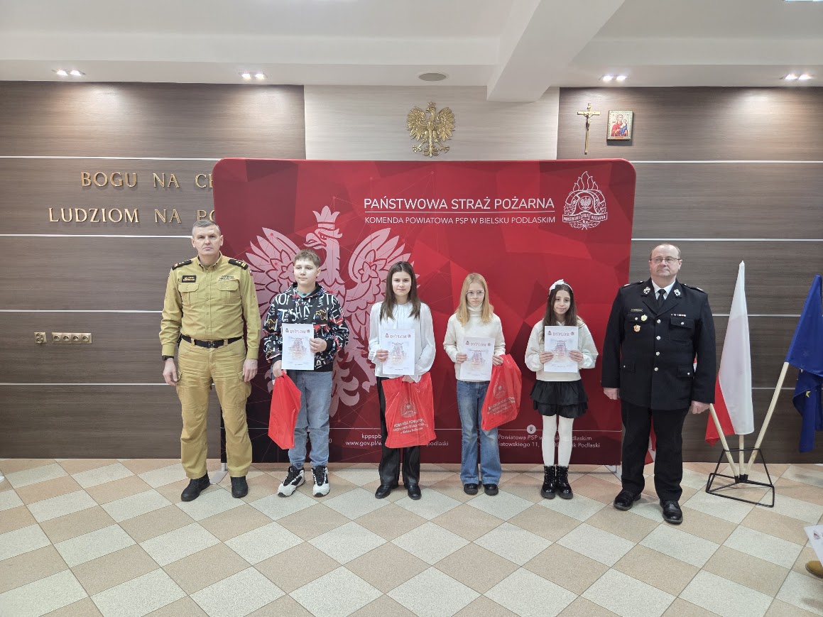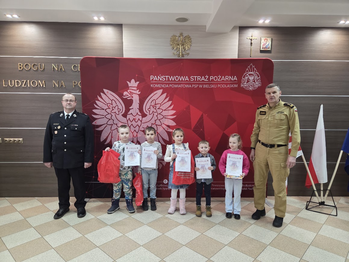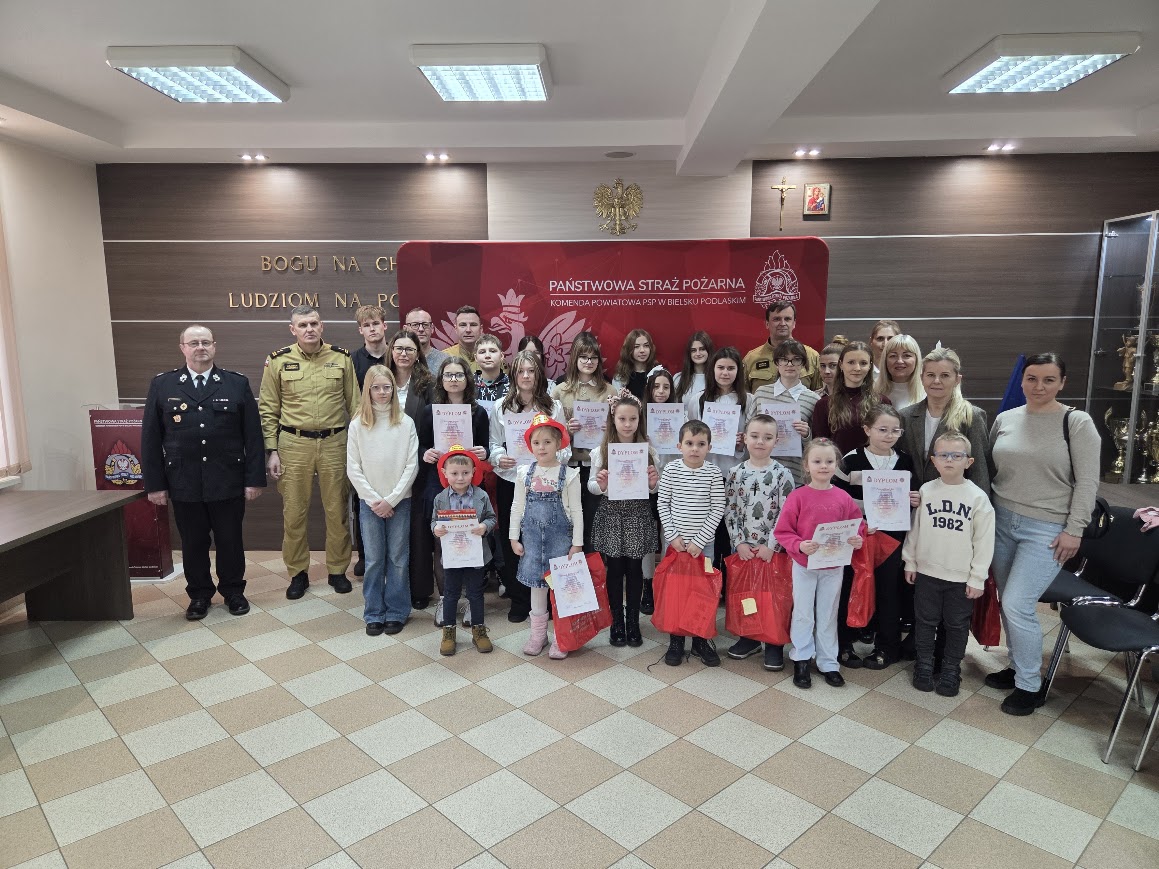 W dniu 25 lutego br. w Komendzie Powiatowej PSP w Bielsku Podlaskim odbyło się uroczyste wręczenie nagród laureatom szczebla powiatowego Ogólnopolskiego Strażackiego Konkursu Plastycznego ”Ziemia, Woda, Powietrze – strażacy na straży ochrony środowiska”. Organizatorem wydarzenia był Zarząd Oddziału Powiatowego Związek Ochotniczych Straży Pożarnych Rzeczypospolitej Polskiej w Bielsku Podlaskim wspólnie z Komendą Powiatową PSP w Bielsku Podlaskim. W uroczystości wzięli udział autorzy nagrodzonych prac oraz ich opiekunowie. Nagrody wręczyli Komendant Powiatowy PSP w Bielsku Podlaskim bryg. Wojciecha Kusznerko wraz z zastępcą st.bryg. Marcinem Sawickim oraz Prezes Oddziału Powiatowego ZOSP RP w Bielsku Podlaskim dh Janusz Kiersnowski.