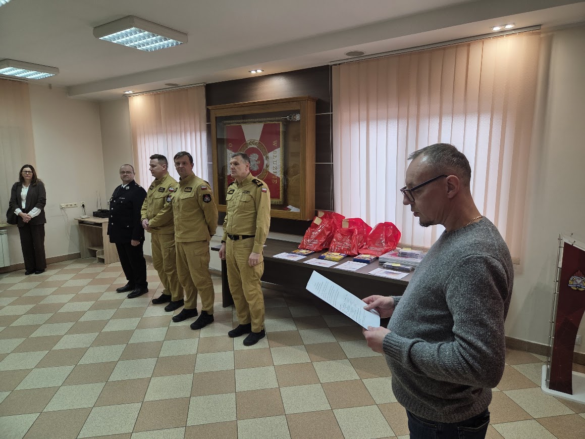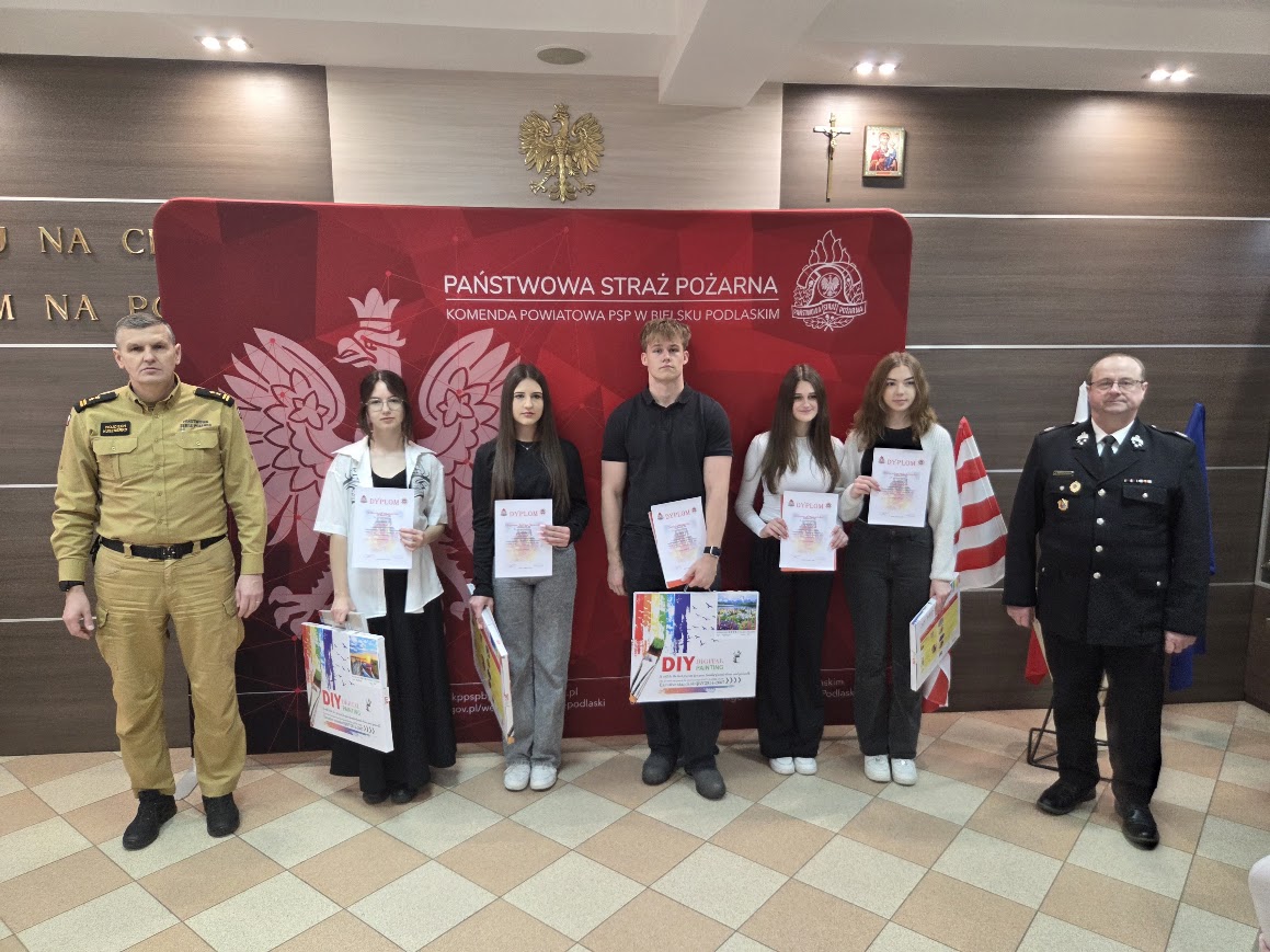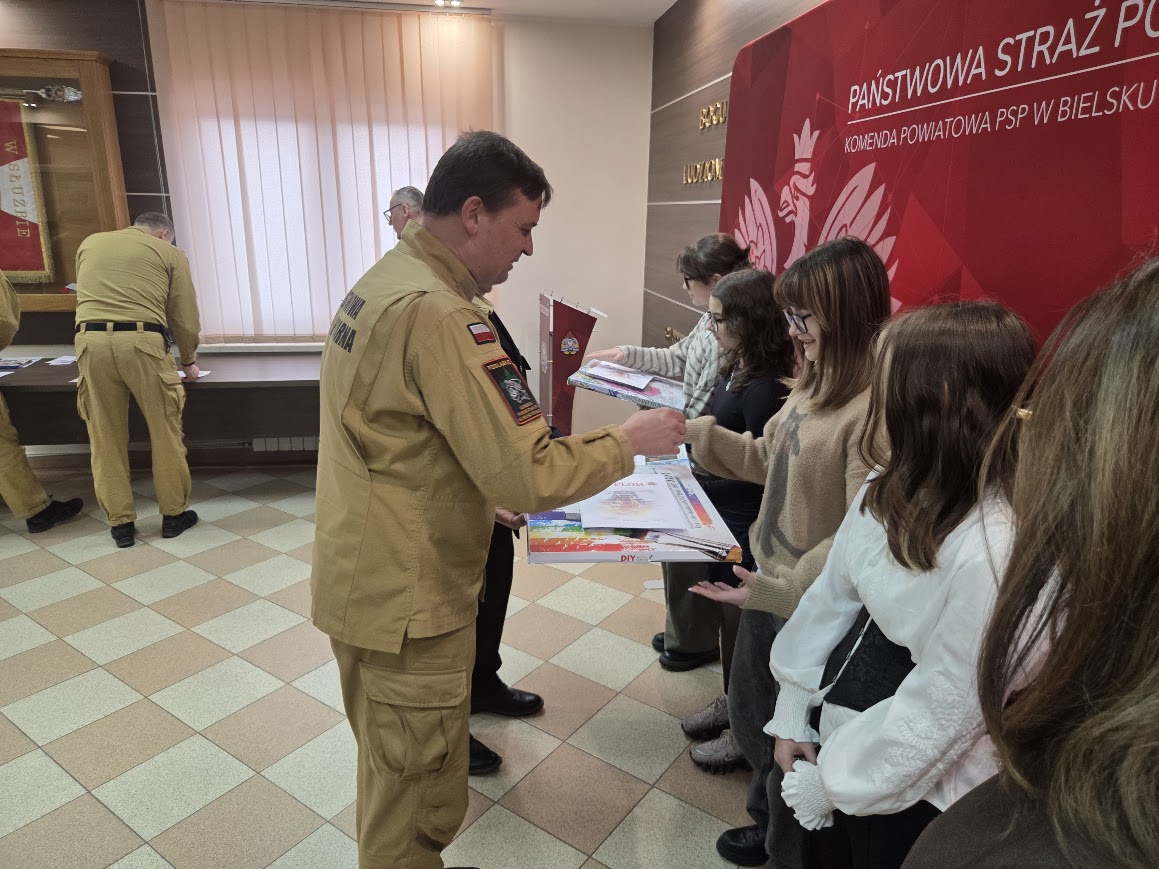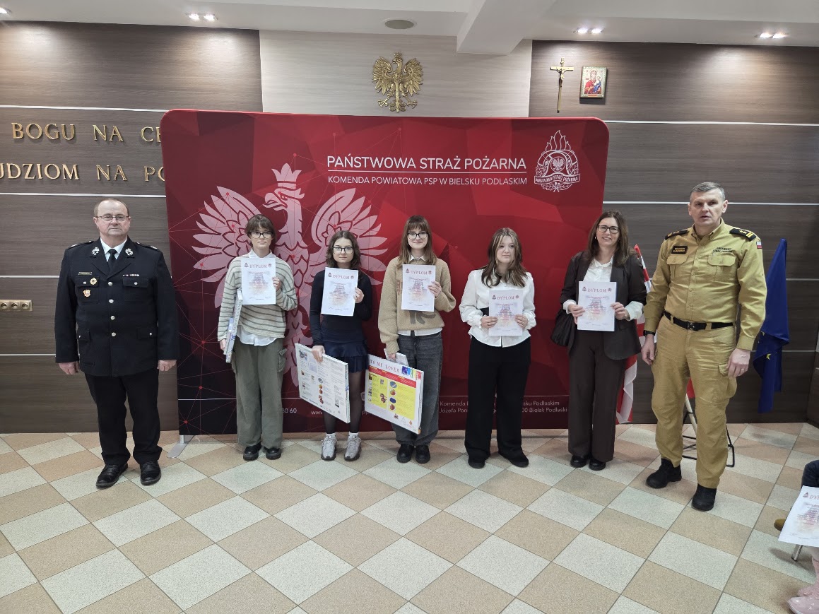 W dniu 25 lutego br. w Komendzie Powiatowej PSP w Bielsku Podlaskim odbyło się uroczyste wręczenie nagród laureatom szczebla powiatowego Ogólnopolskiego Strażackiego Konkursu Plastycznego ”Ziemia, Woda, Powietrze – strażacy na straży ochrony środowiska”. Organizatorem wydarzenia był Zarząd Oddziału Powiatowego Związek Ochotniczych Straży Pożarnych Rzeczypospolitej Polskiej w Bielsku Podlaskim wspólnie z Komendą Powiatową PSP w Bielsku Podlaskim. W uroczystości wzięli udział autorzy nagrodzonych prac oraz ich opiekunowie. Nagrody wręczyli Komendant Powiatowy PSP w Bielsku Podlaskim bryg. Wojciecha Kusznerko wraz z zastępcą st.bryg. Marcinem Sawickim oraz Prezes Oddziału Powiatowego ZOSP RP w Bielsku Podlaskim dh Janusz Kiersnowski.
