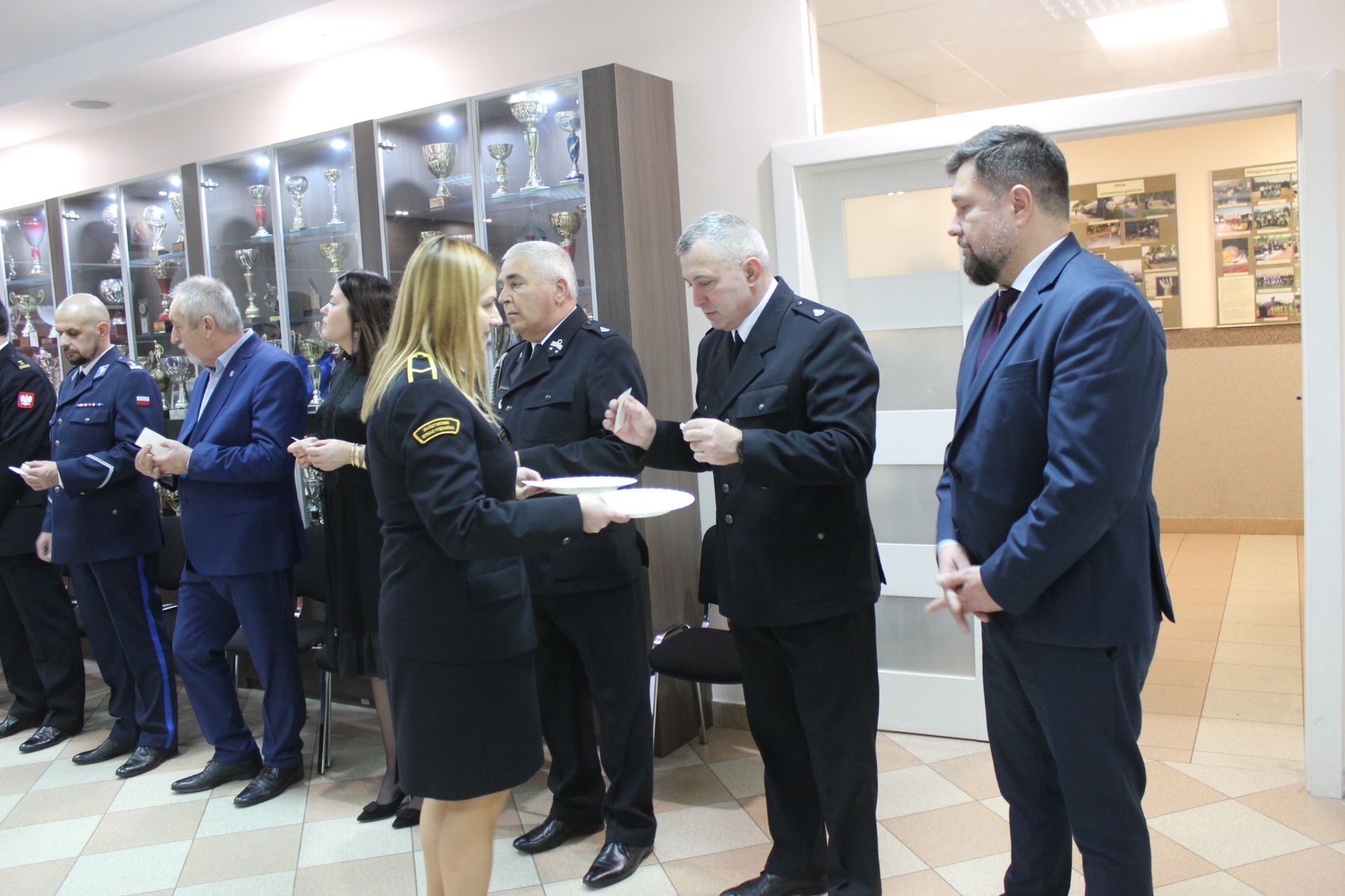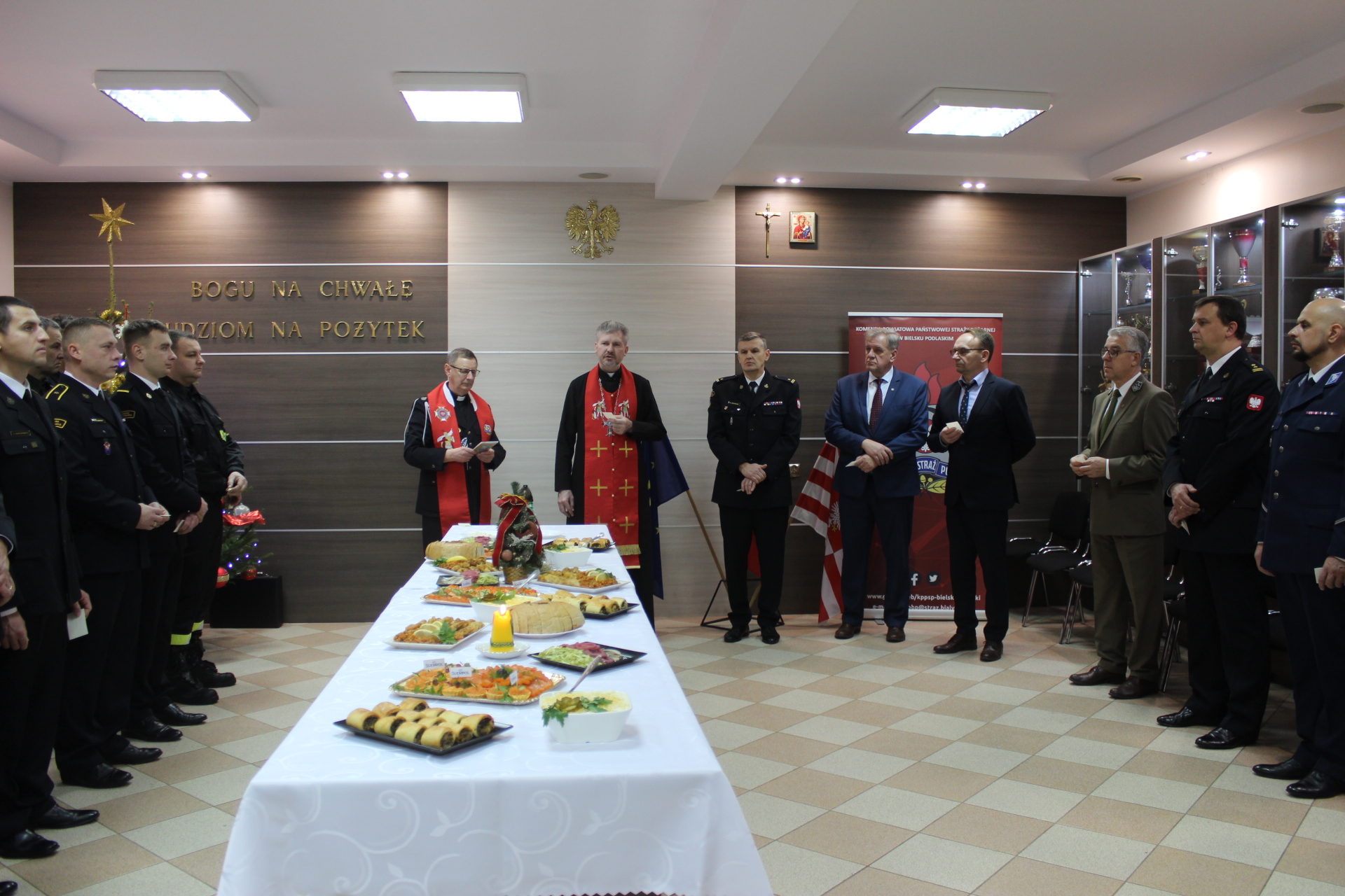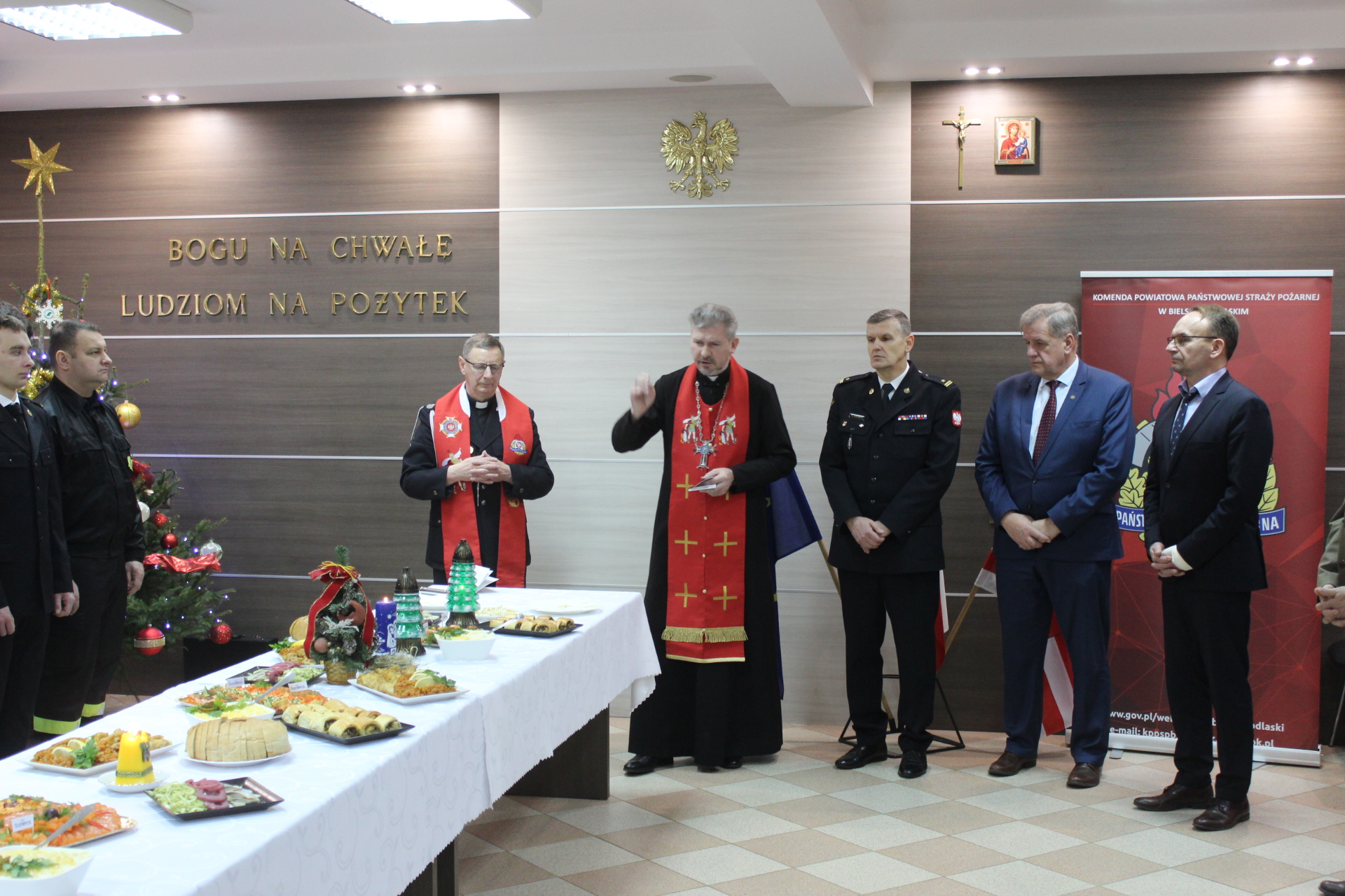 20 grudnia 2024 roku w Komendzie Powiatowej Państwowej Straży Pożarnej w Bielsku Podlaskim, w związku z nadchodzącymi Świętami Bożego Narodzenia, odbyło się uroczyste spotkanie opłatkowe. Uczestniczyli w nim Komendant Powiatowy PSP mł. bryg. Wojciech Kusznerko, Zastępca Komendanta Powiatowego PSP bryg. Marcin Sawcki, strażacy i pracownicy Komendy Powiatowej PSP w Bielsku Podlaskim oraz zaproszeni goście i kapelani strażaków.