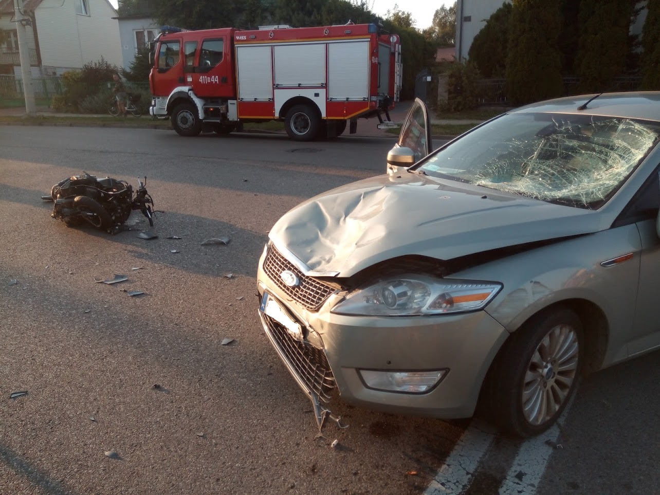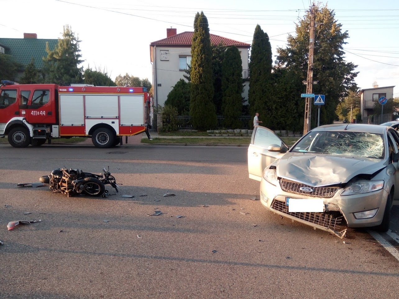 Po przybyciu zastępów na miejscu zdarzenia stwierdzono rozbity samochód osobowy Ford Mondeo oraz skuter. Działania zastępów polegały na zabezpieczeniu miejsca zdarzenia, odłączeniu akumulatorów, pomocy przetransportowania poszkodowanego na noszach typu deska do karetki.