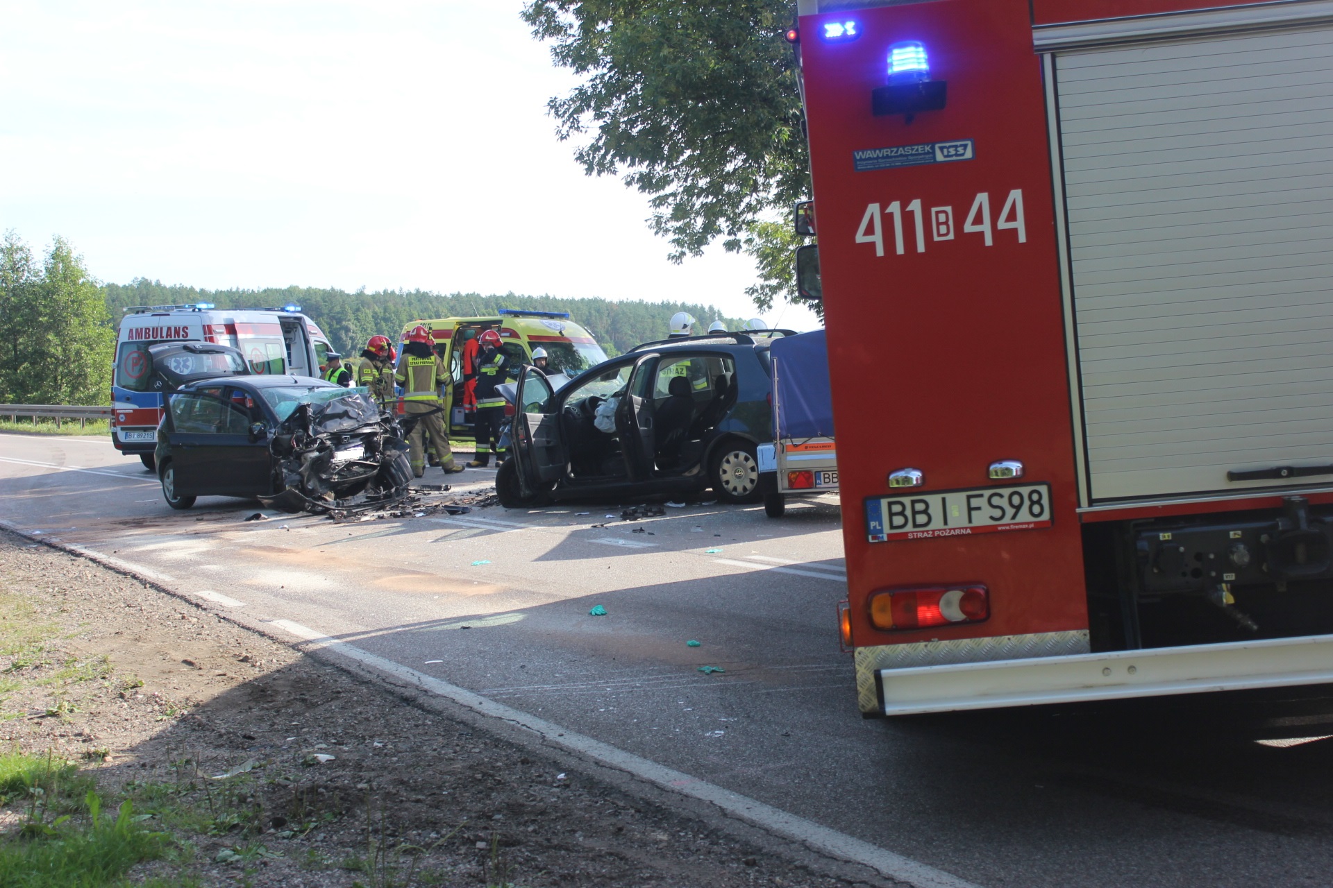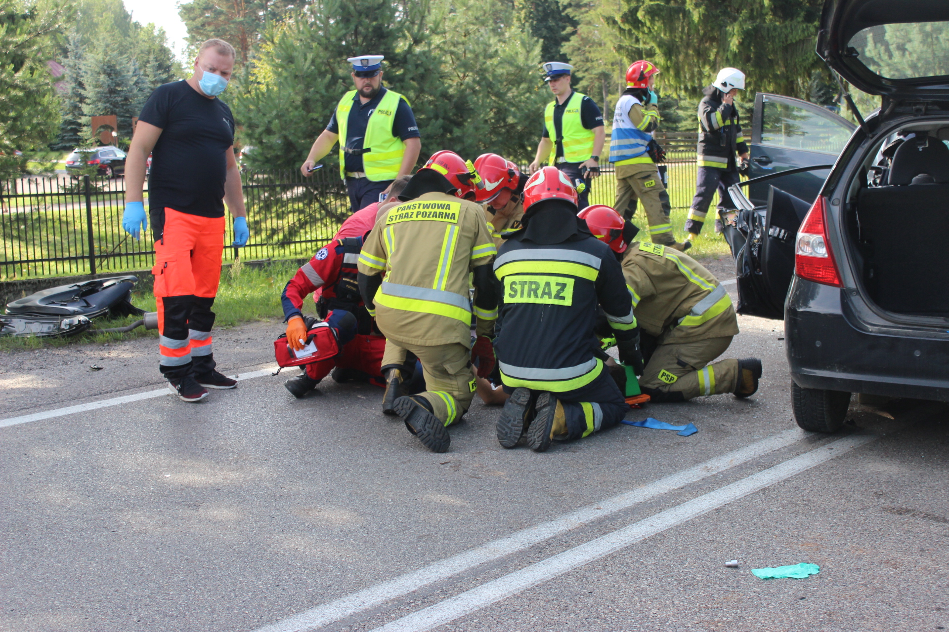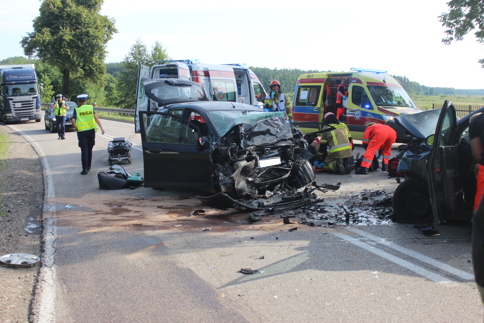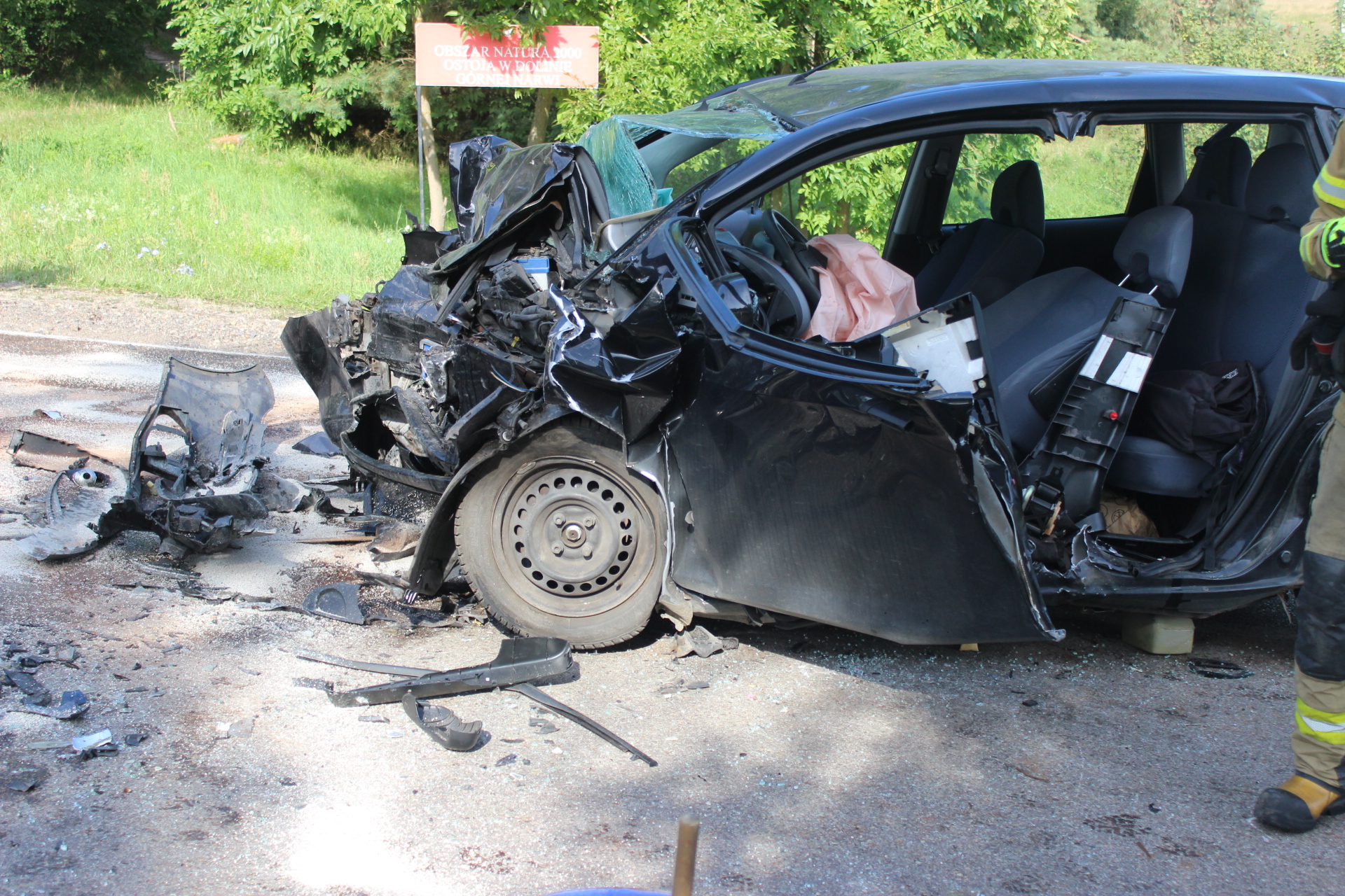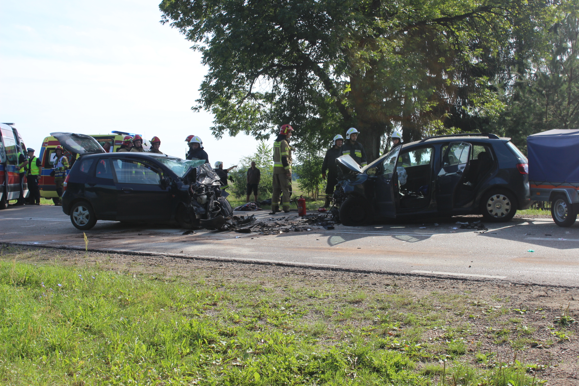 Po przybyciu strażaków na miejsce zdarzenia ustalono, że zderzyły się dwa samochody osobowe, którymi podróżowały łącznie 3 osoby. Jedna z osób pozostawała zakleszczona wewnątrz rozbitego pojazdu. Pozostali uczestnicy zdarzenia byli pod opieką przybyłych na miejsce zdarzenia Zespołów Ratownictwa Medycznego. Na miejsce zdarzenia zadysponowany został śmigłowiec Lotniczego Pogotowia Ratunkowego.