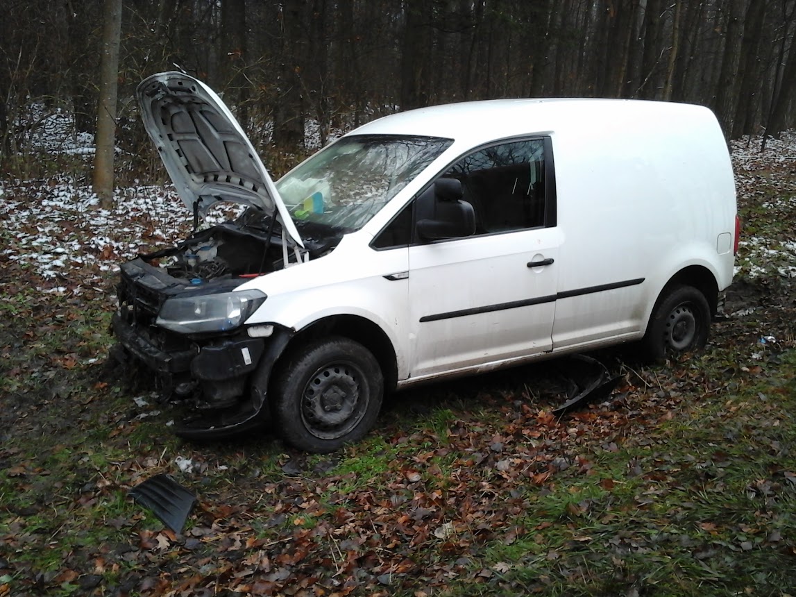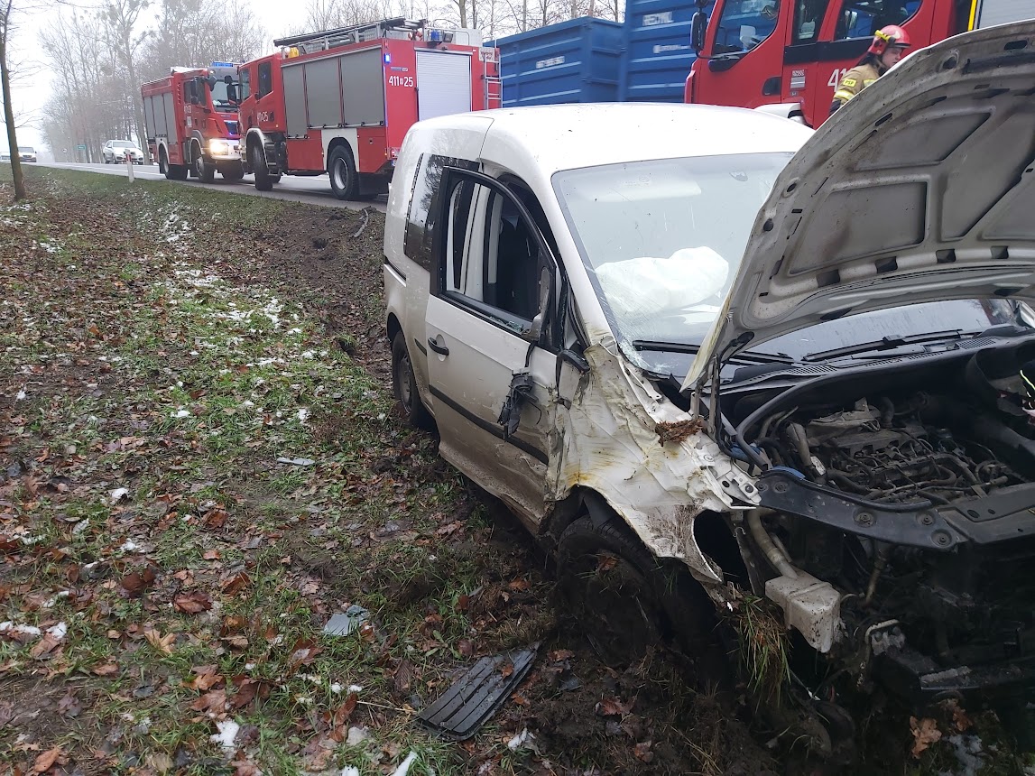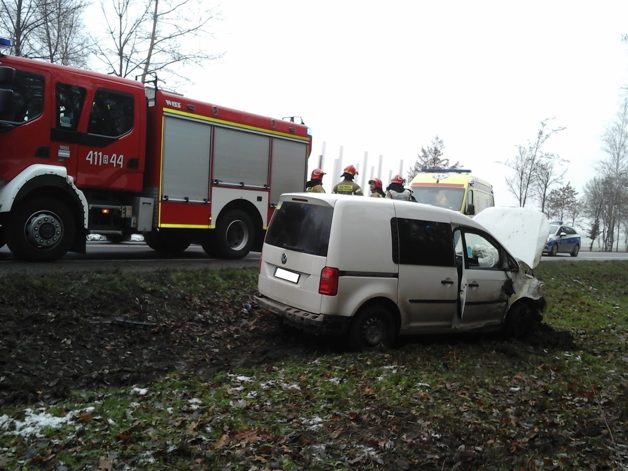 Po przybyciu na miejscu zdarzenia strażacy ustalili, że samochód osobowy VW Caddy zjechał z jezdni, otarł się o drzewo i po uderzeniu w skarpę rowu zatrzymał się na kołach na poboczu jezdni. Autem podróżowały osoby. Opuścili oni uszkodzone pojazd przed przybyciem zastępów straży pożarnej. Jedna osoba została ranna.