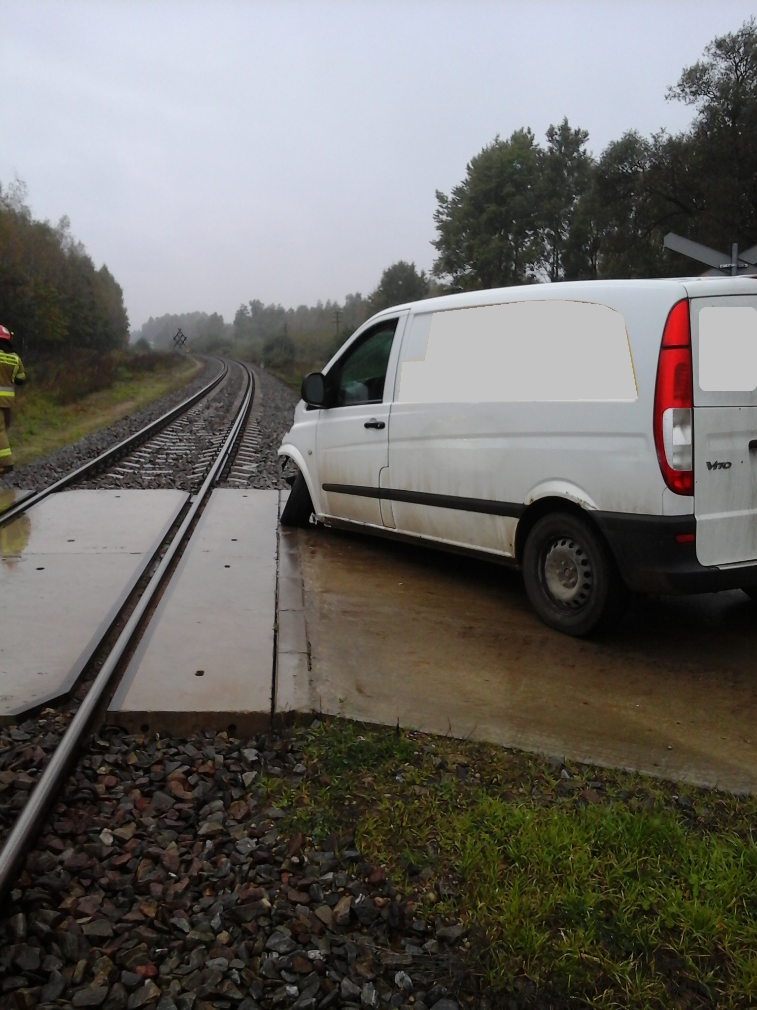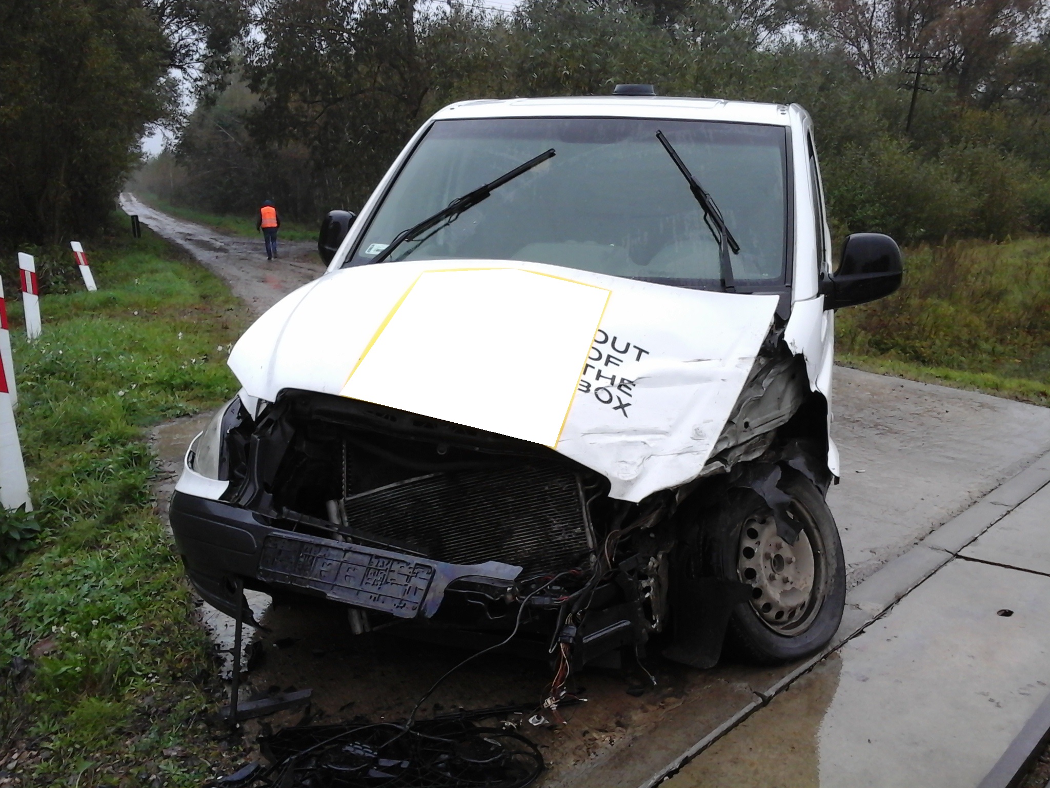 Wypadek na przejeździe kolejowym – samochód dostawczy wjechał pod nadjeżdżający szynobus.