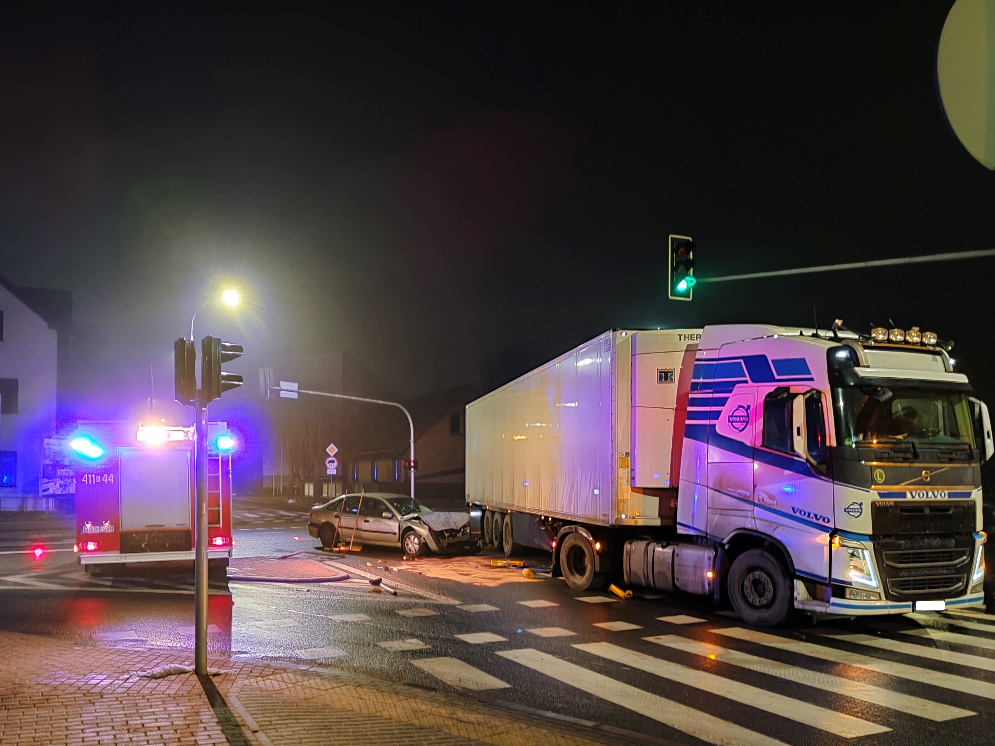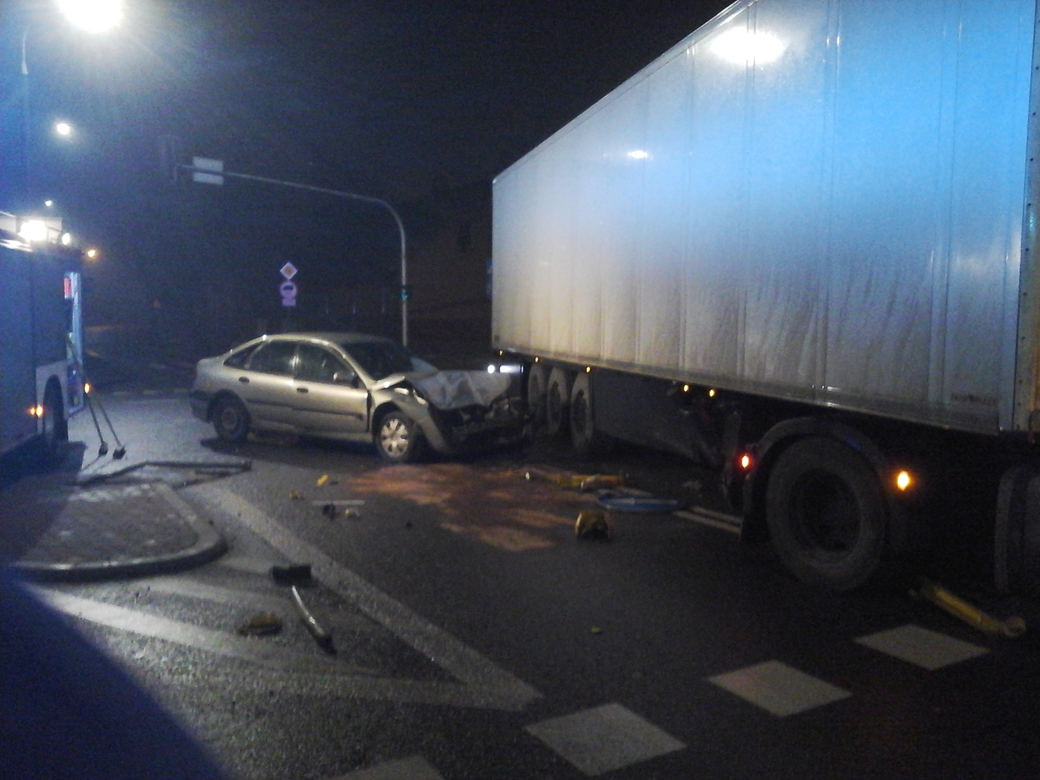 W chwili przybycia zastępów straży pożarnej na miejsce zastano uszkodzone pojazdy stojące na jezdni. Samochodem ciężarowym marki Volvo podróżował jedynie kierowca. Nie doznał on żadnych obrażeń i nie potrzebował opieki medycznej. Autem osobowym Renault Laguna podróżowały dwie osoby. Oddaliły się one z miejsca zdarzenia.